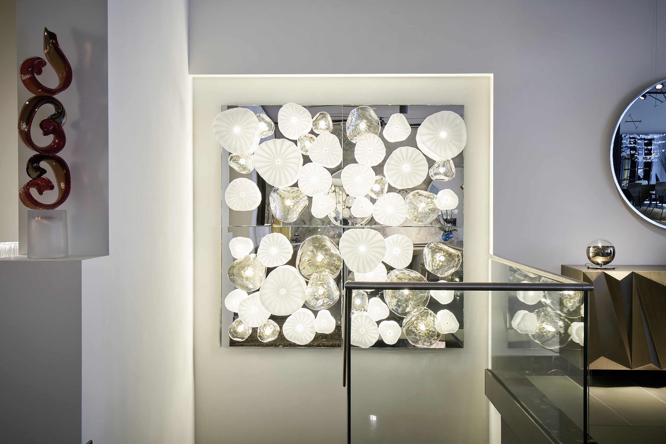 Modular panel with decorative and lighting function, made of mirrored glass with floral elements in Murano glass. Designed for modular wall or ceiling installations, allowing customized scenographic compositions.