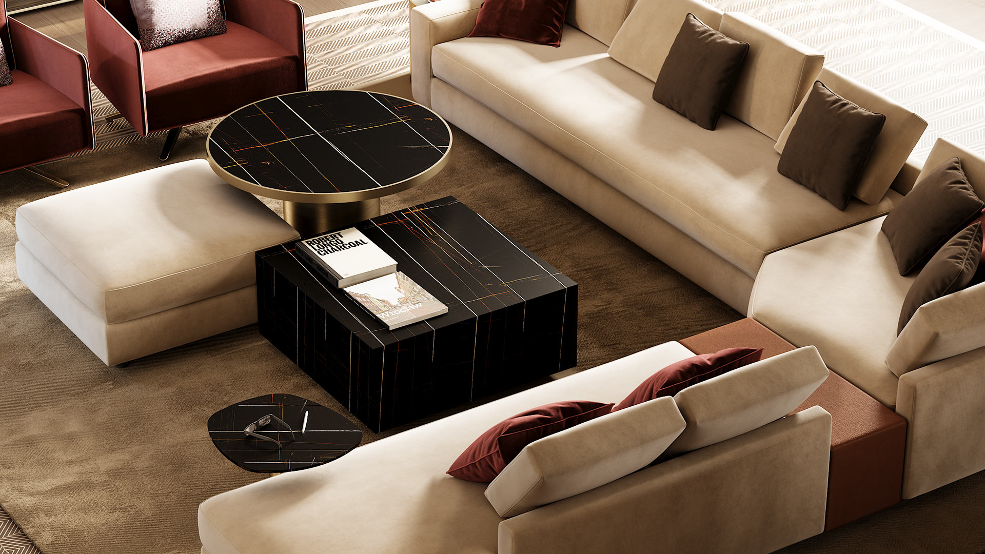 System of coffee tables and sofa inserts with internal wooden structure and external covering in leather or glass.