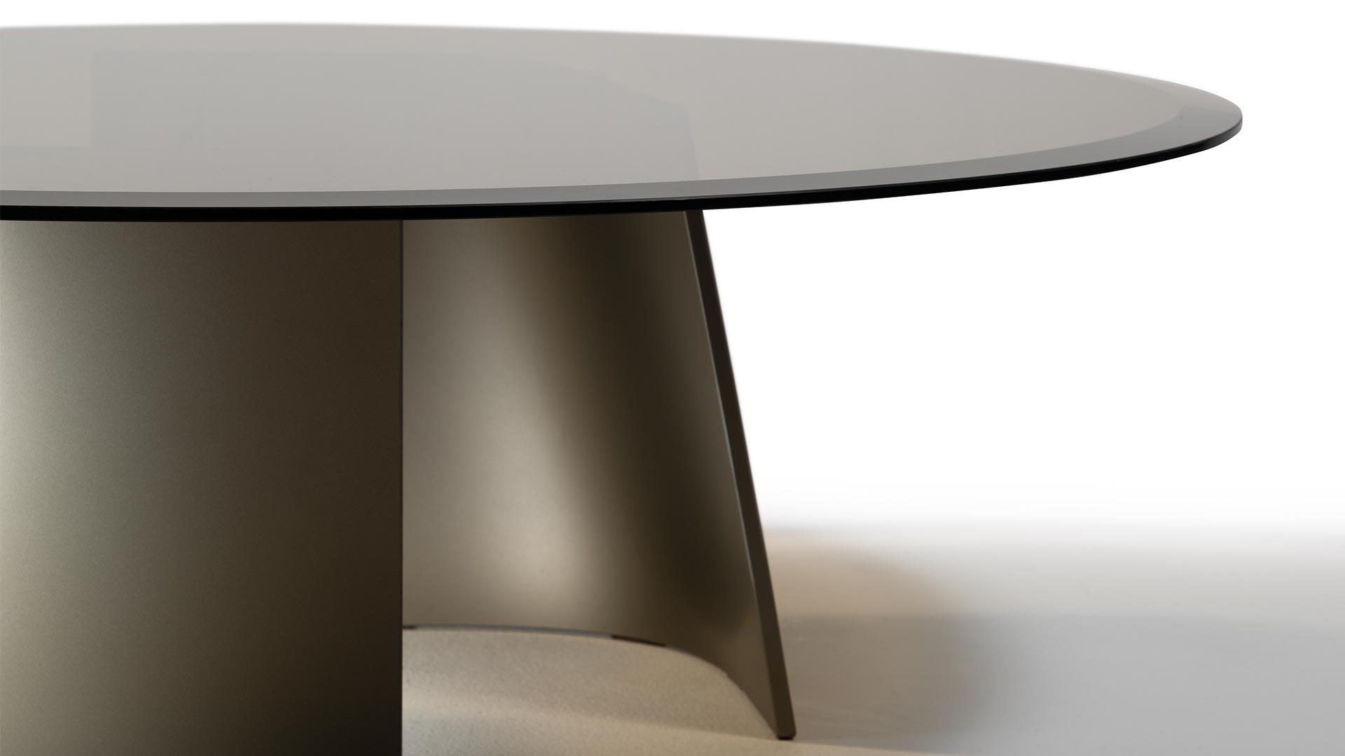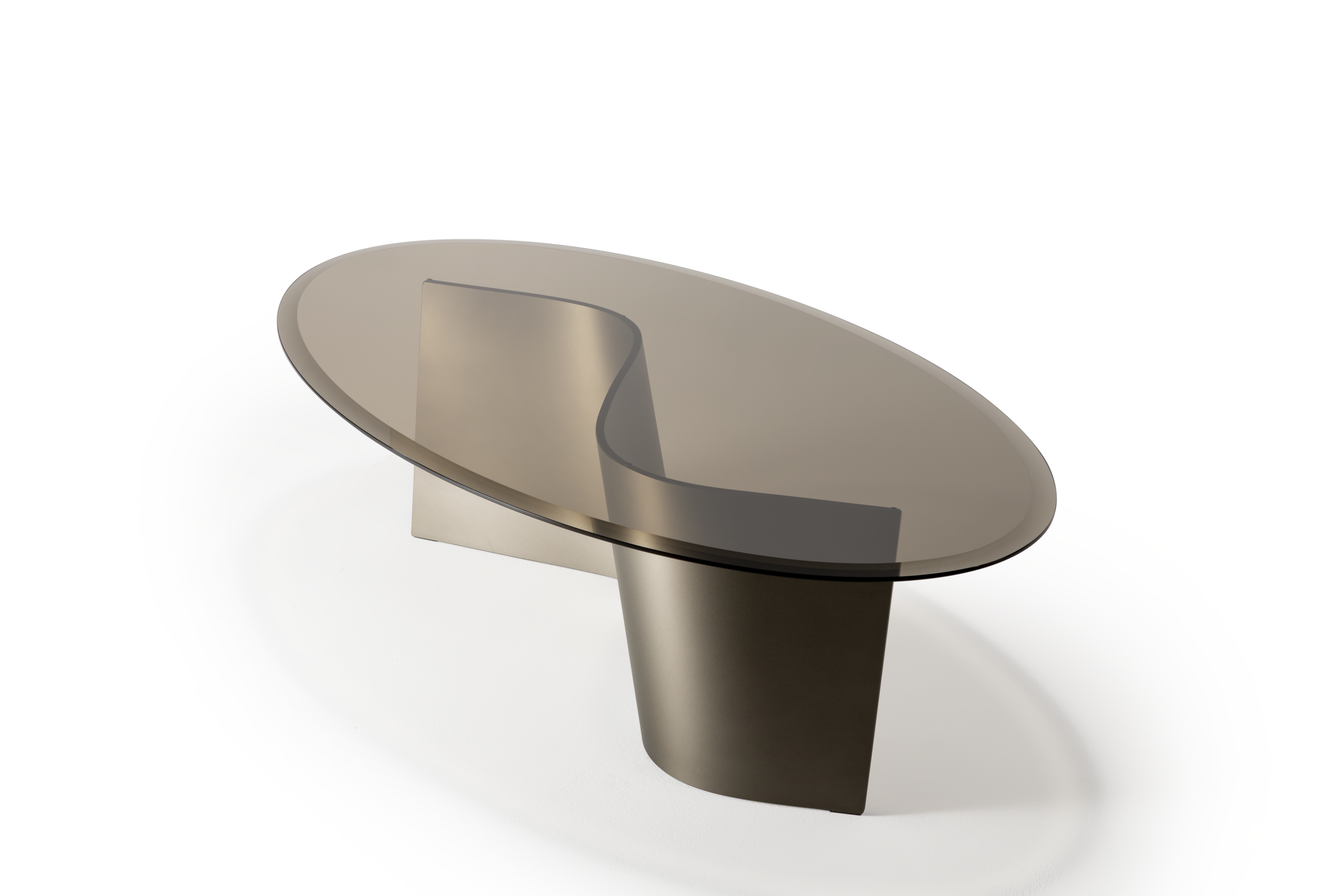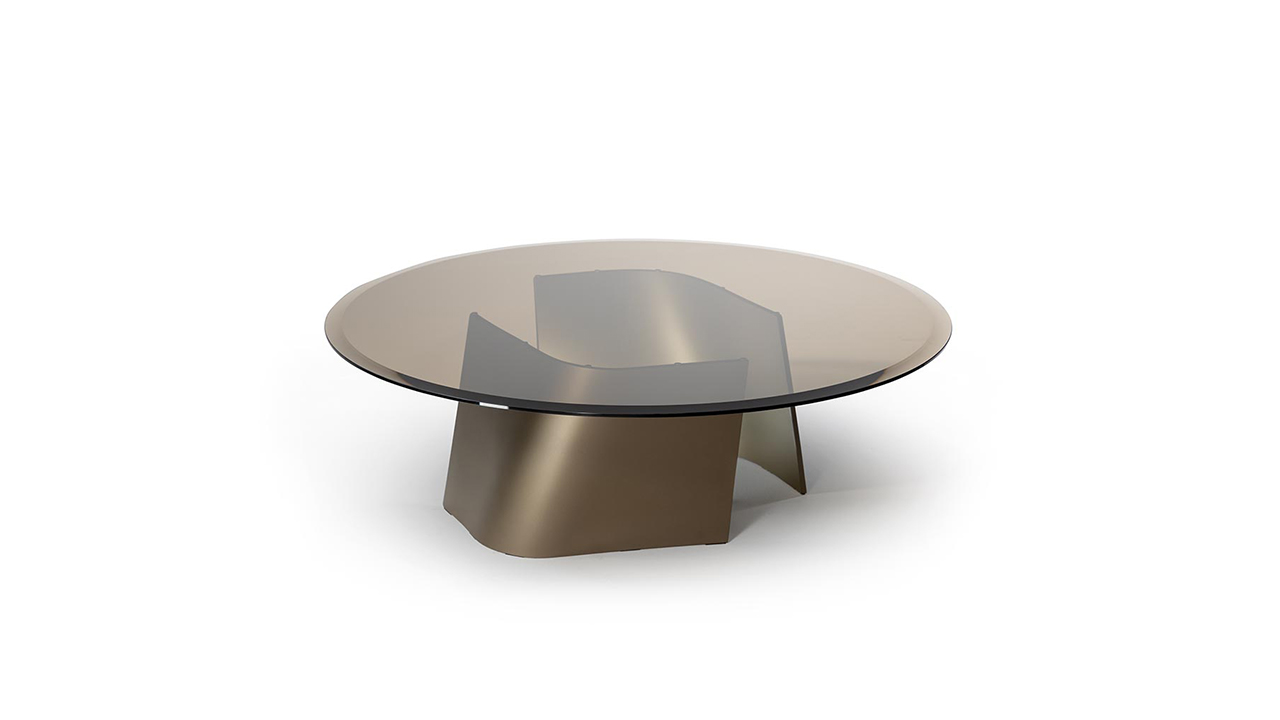 Coffee table with curved extra-clear glass base and bronze glass top, featuring compact proportions and defined geometries.