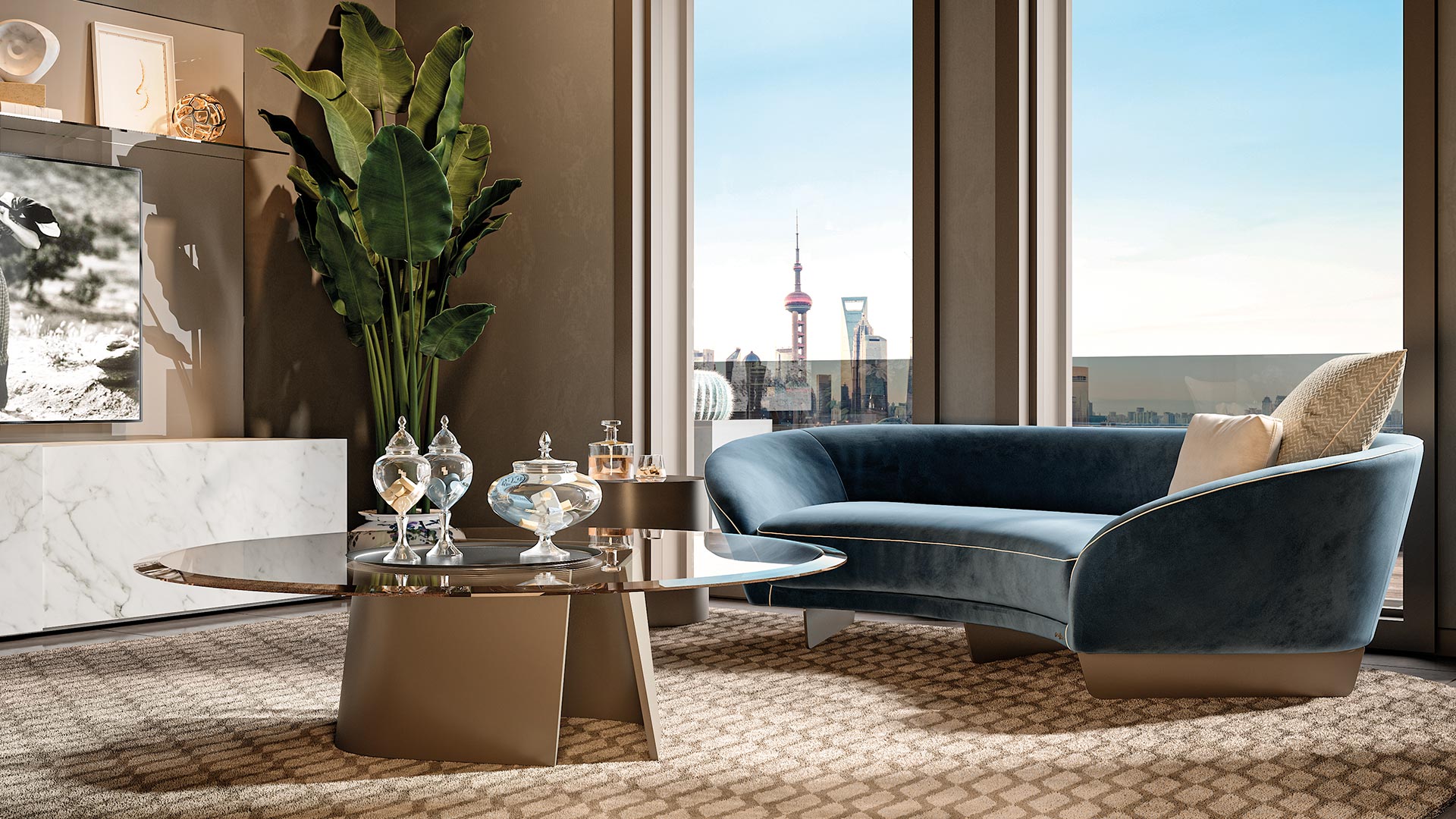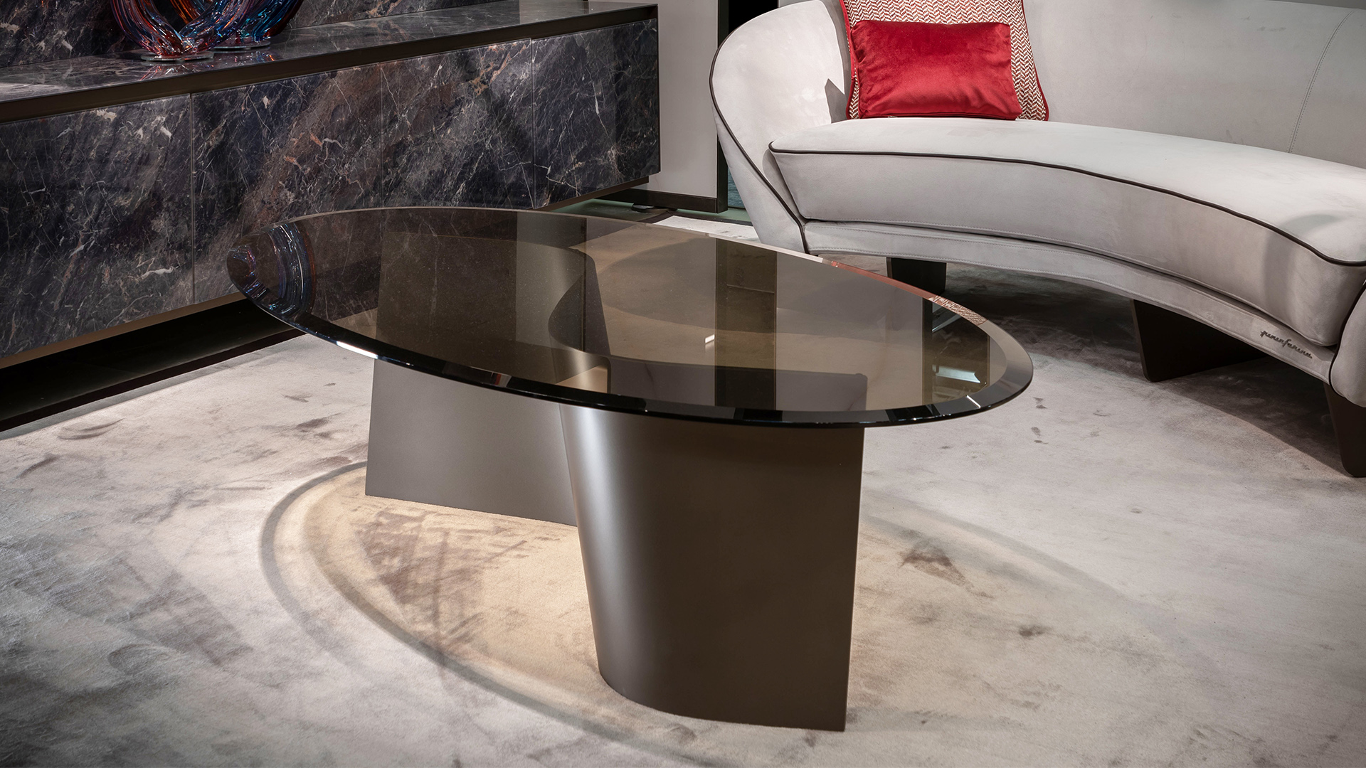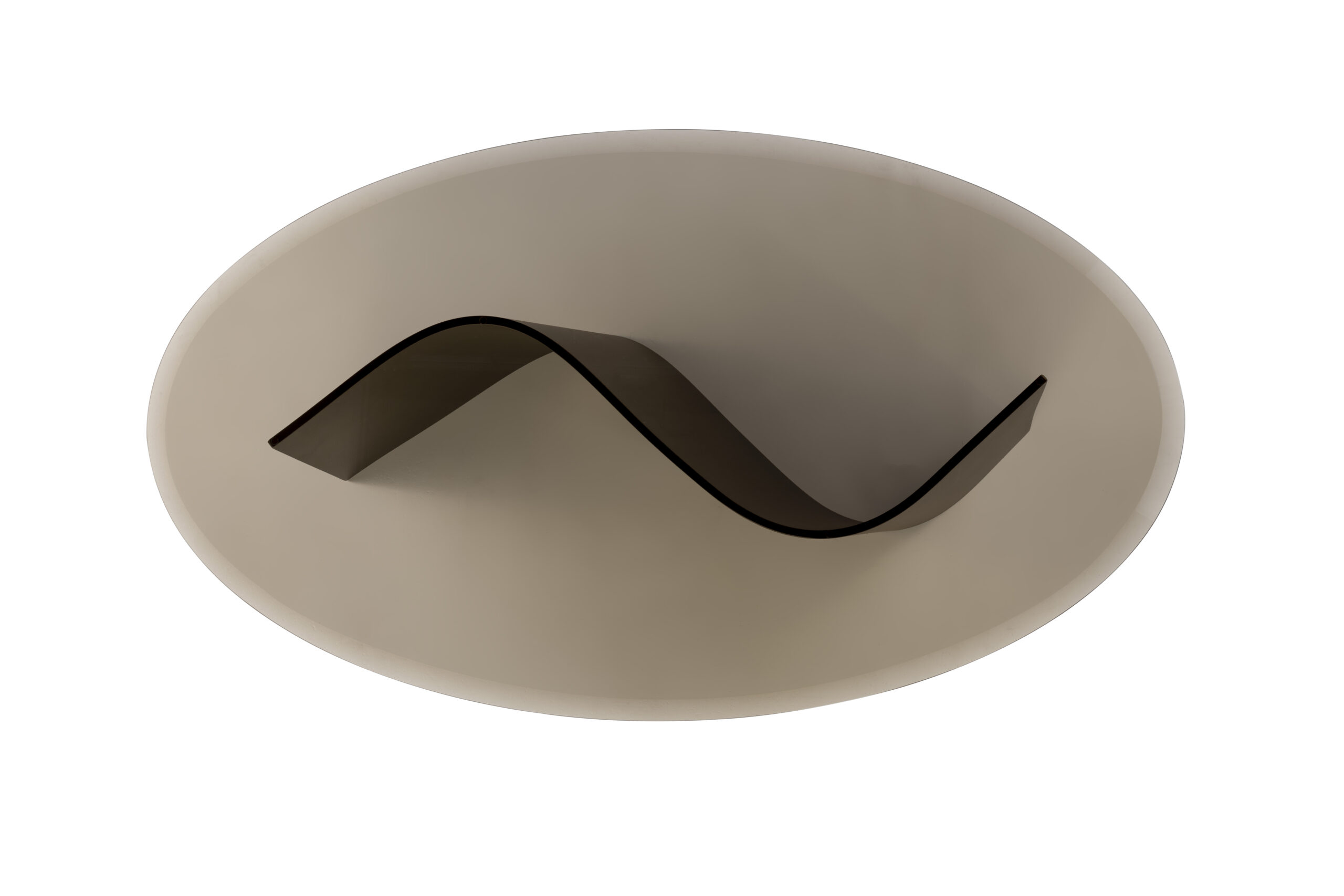 Coffee table with curved extra-clear glass base and bronze glass top, featuring compact proportions and defined geometries.