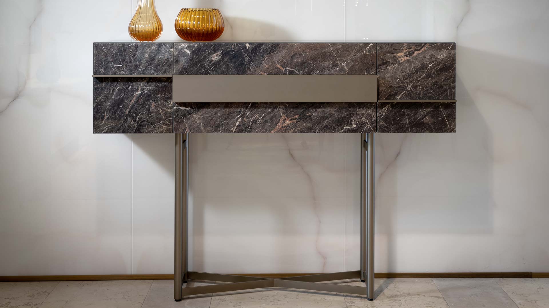 Tall buffet with wood structure covered in Marmoreflex or Legnoreflex, featuring metallic details in Bronze finish.