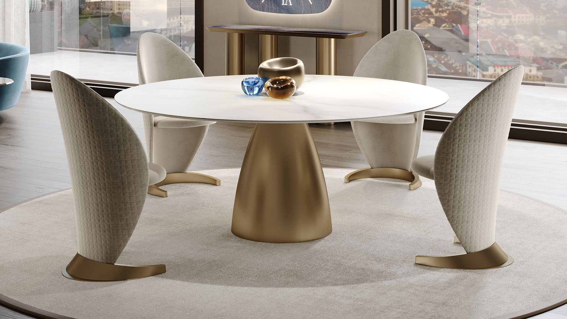 Chair with padded wooden frame and upholstered in leather or fabric. Base in Bronze, graphite or titanium finish. Optional ar