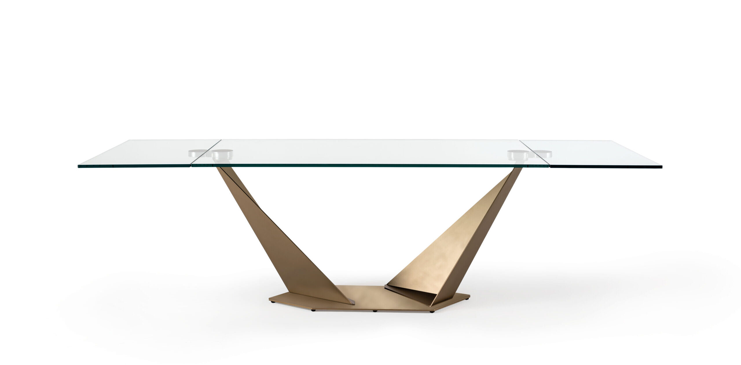 Extendable dining table with metal base and top available in various material configurations.
