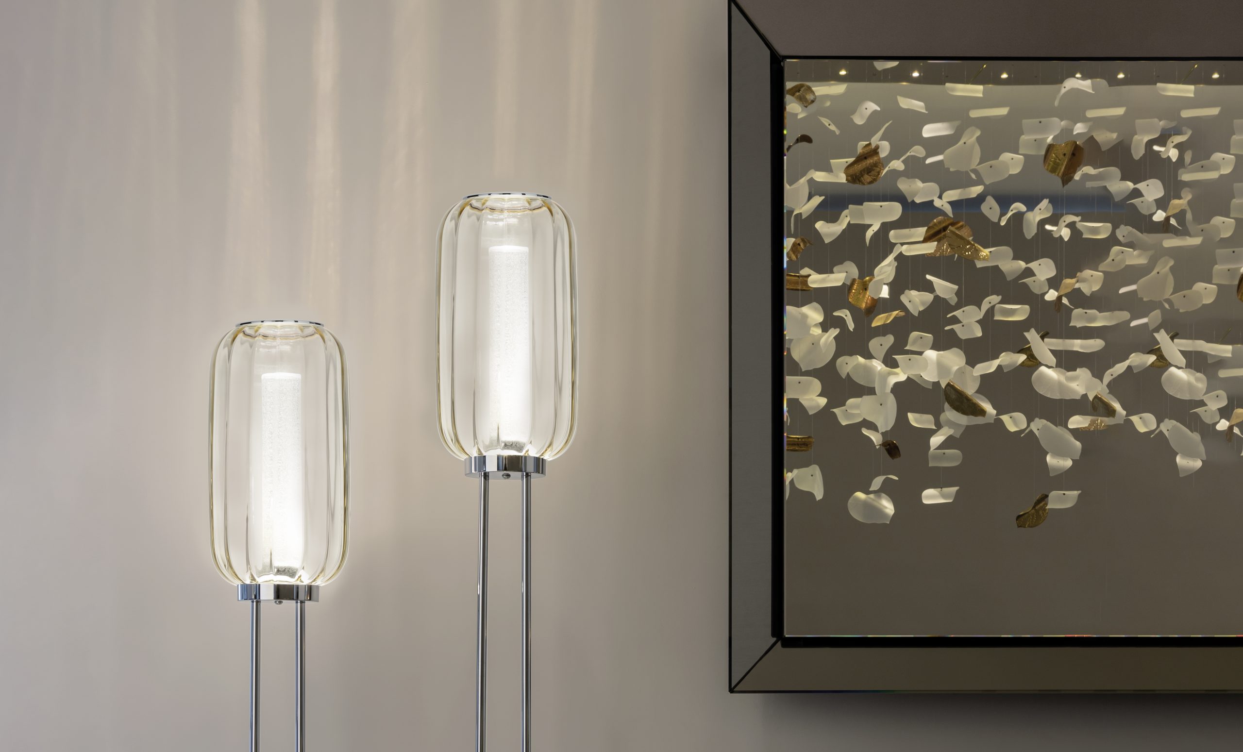 Floor lamp with a vertical and elegant line, featuring a luminous body in artistic glass and a chrome metal structure that emphasizes its lightness and overall brilliance.