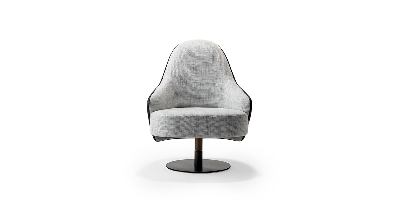 Armchair with a wooden frame, upholstered seat and backrest. Available with wooden legs or a round swivel metal base in Bronze finish (100M).