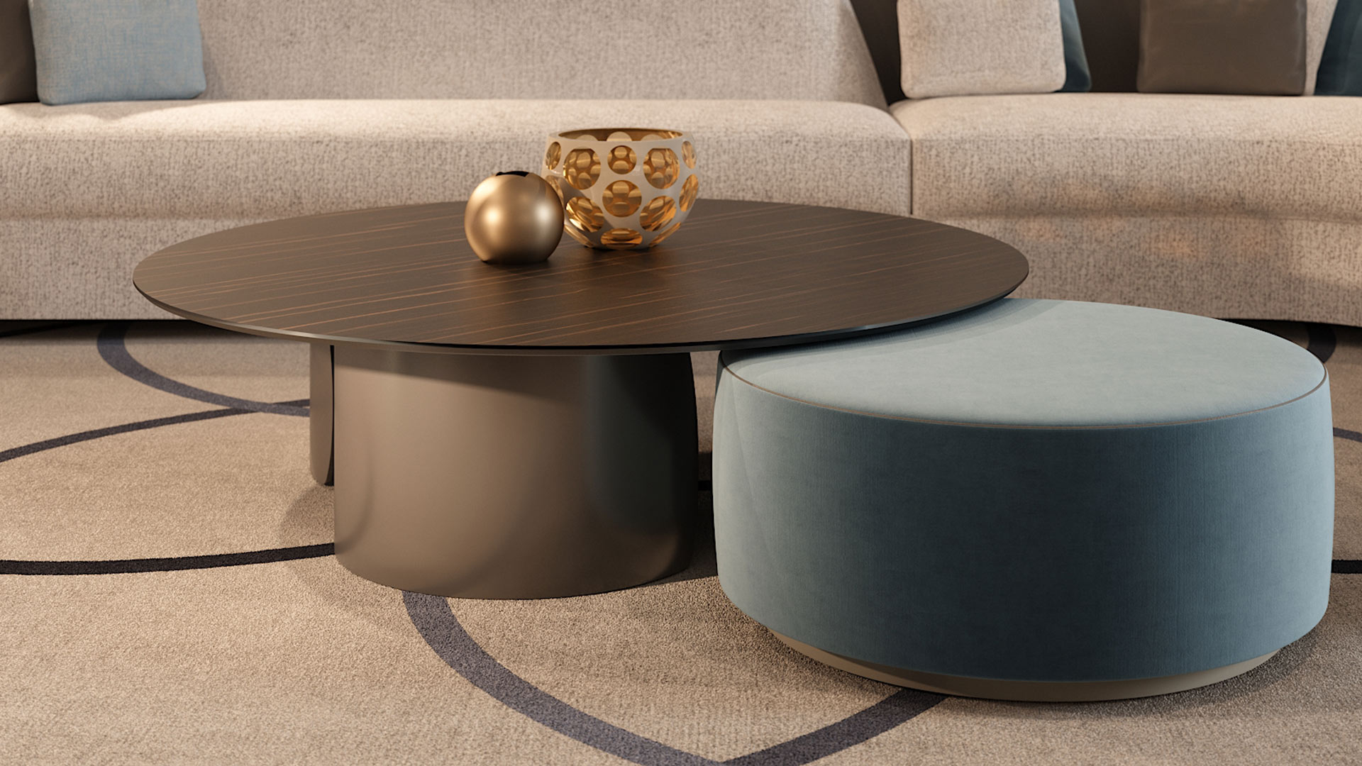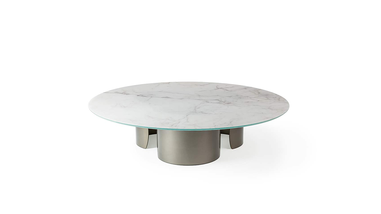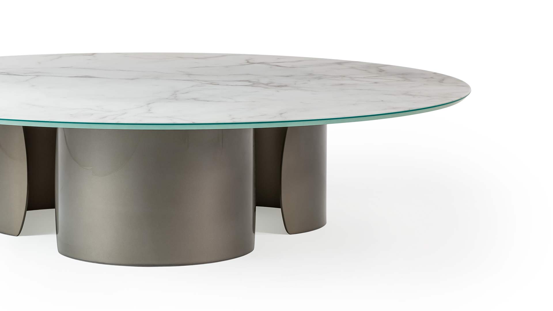 Coffee table with curved extra-clear glass bases, defined by a light and sculptural design. The glass bases, painted in Bronze finish (100M), support tops available in various material and formal configurations.