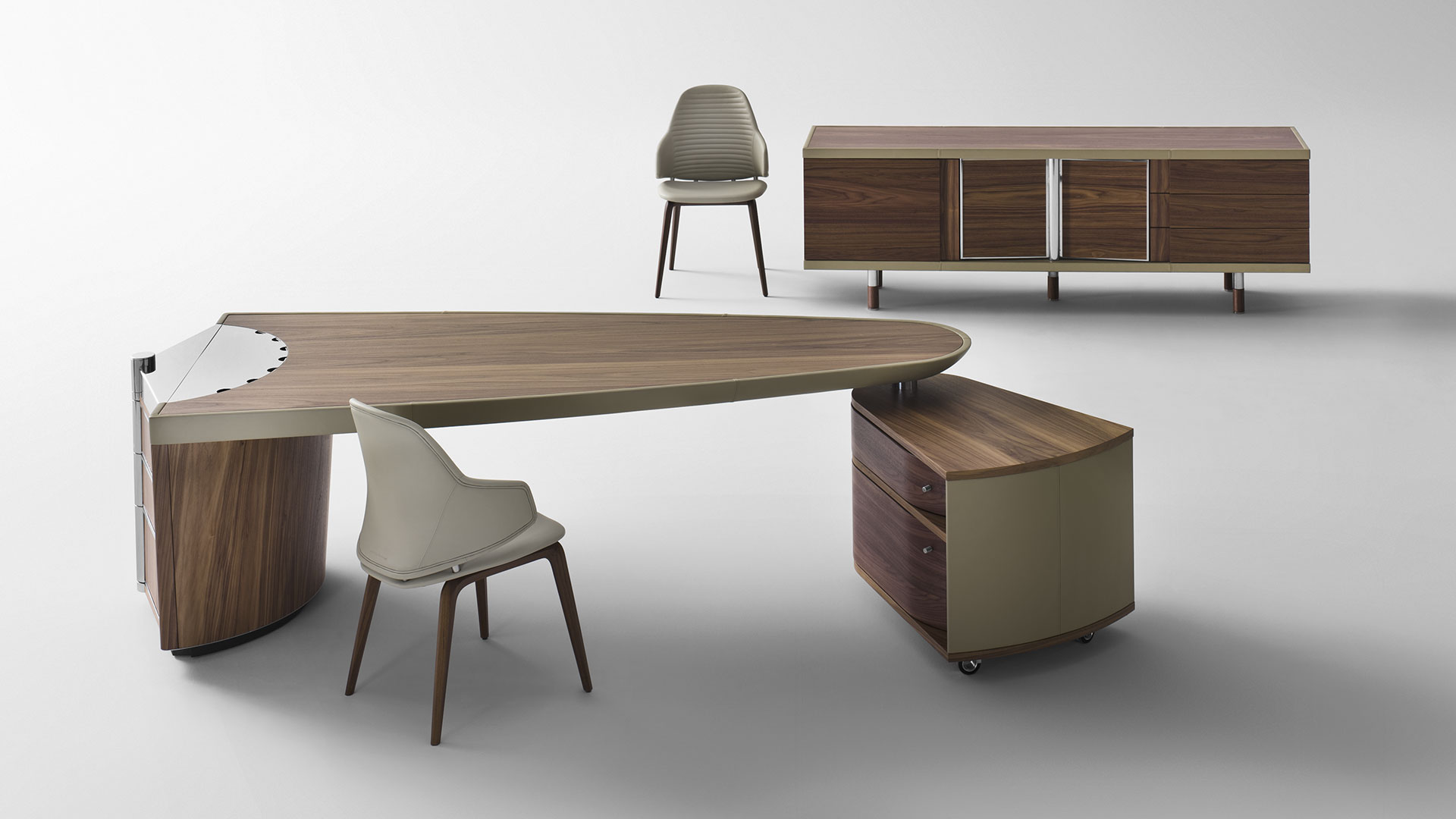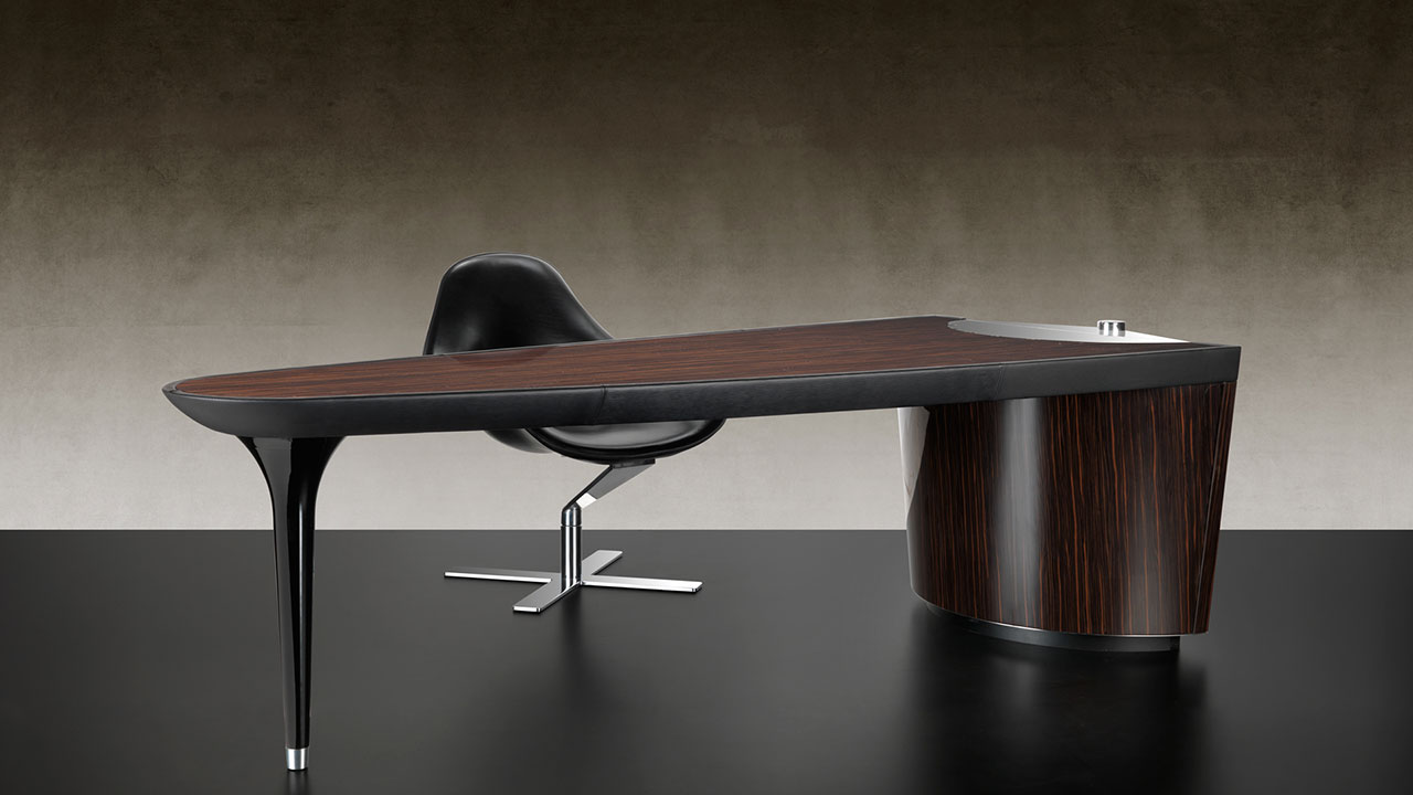 Executive desk featuring a sculptural structure and integrated functional solutions. Ark combines noble materials, advanced mechanisms, and precise detailing, ideal for executive offices and representative studies.