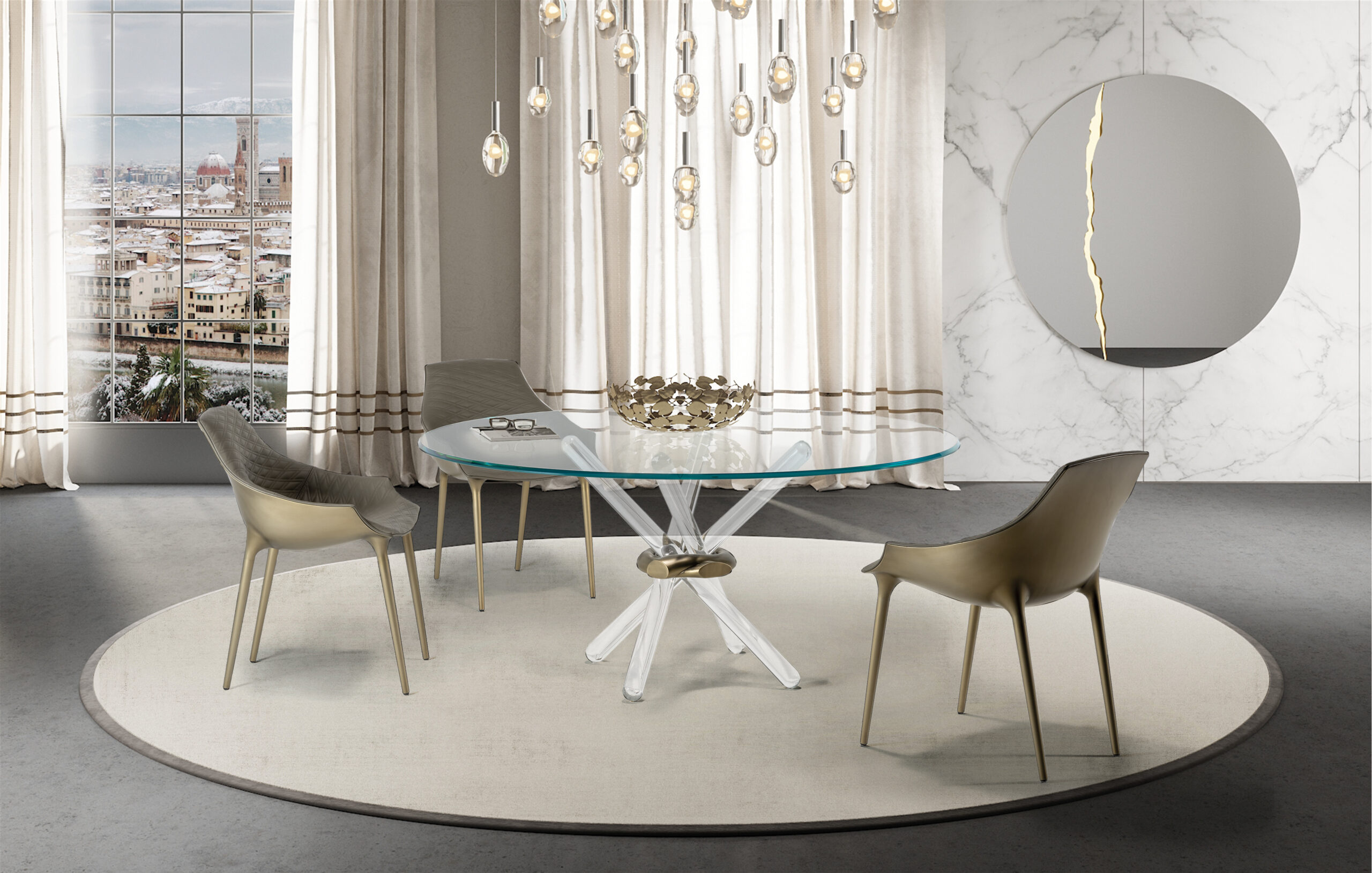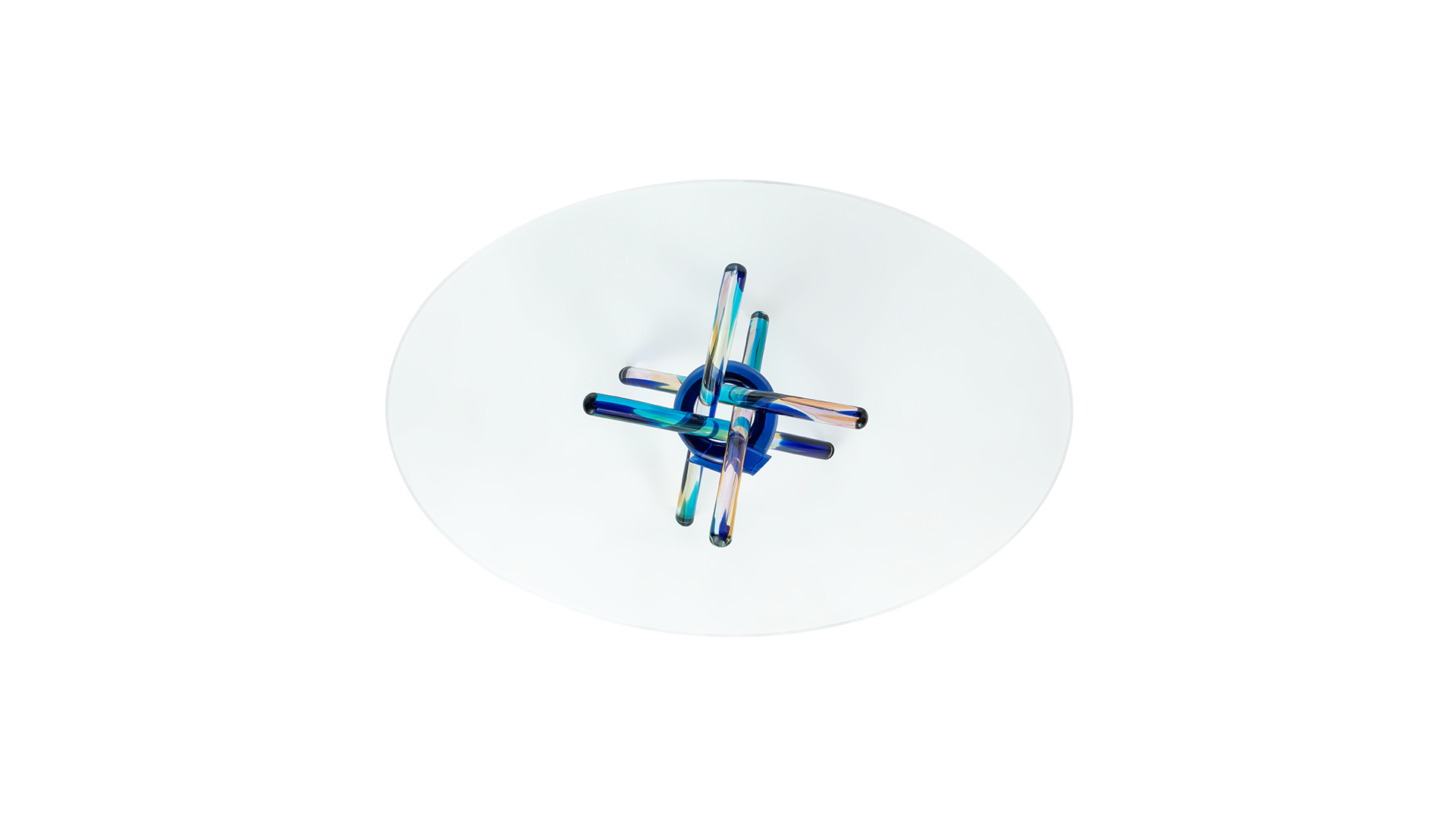 Dining table with smooth Murano glass base available in blue, green, ruby, clear, or sandblasted white. Ring in sandblasted white Murano glass or wood in Bronze, brass, dark brass, or titanium finish. Base also available in Murano glass DECO’ finish with blue ring.