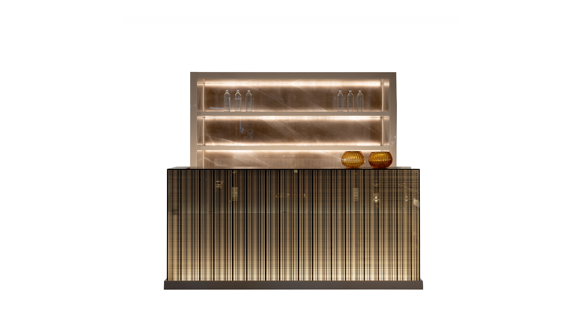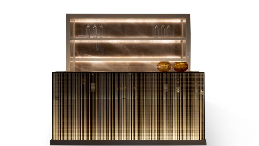 Scenographic and architectural bar system designed as a central element for high-end living, lounge, or contract spaces. Avantgarde Bar combines glass, light, and glossy lacquered surfaces in an elegant, highly decorative composition.