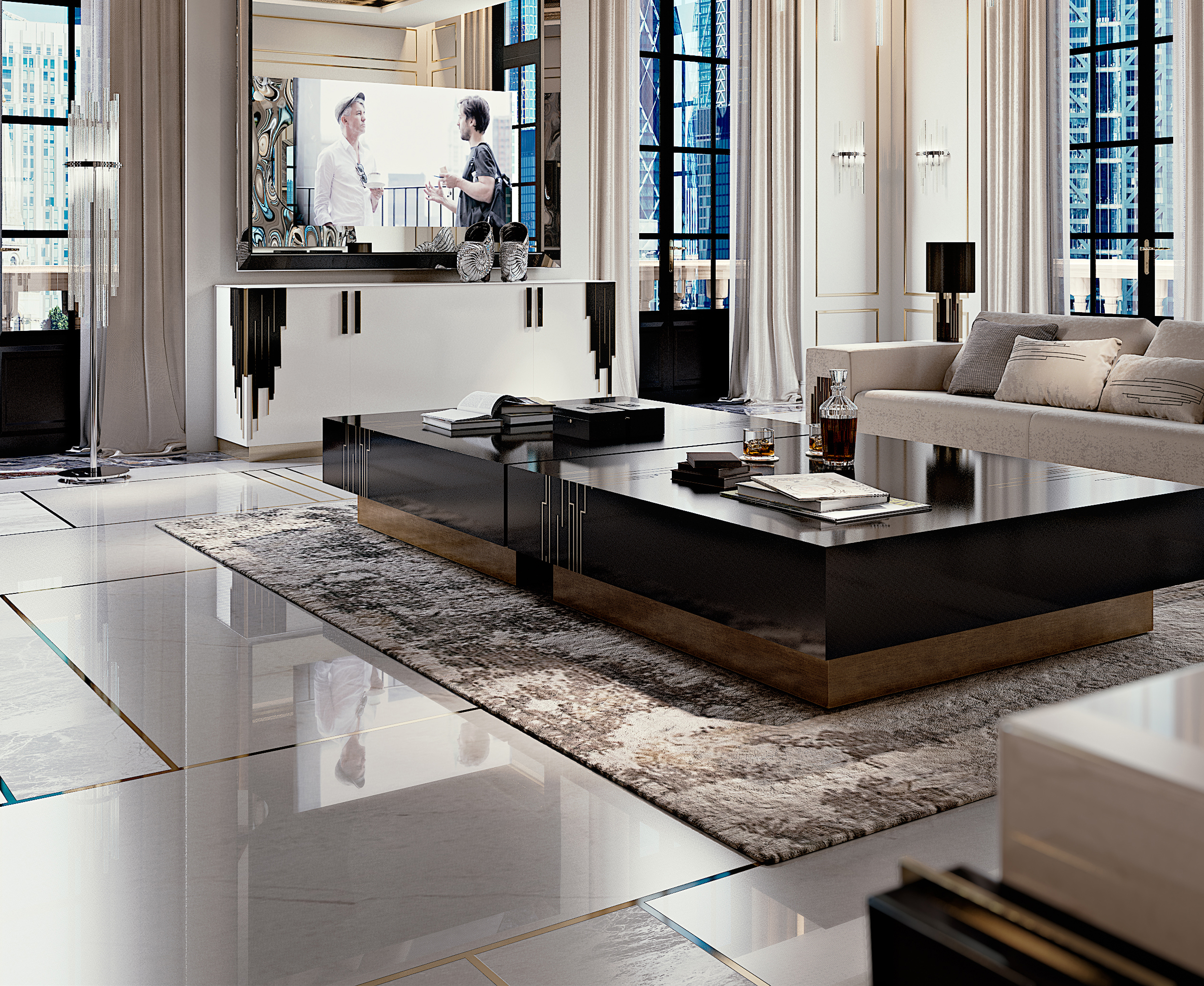 • Wood covered with lacquered glass featuring gold silkscreen decorations