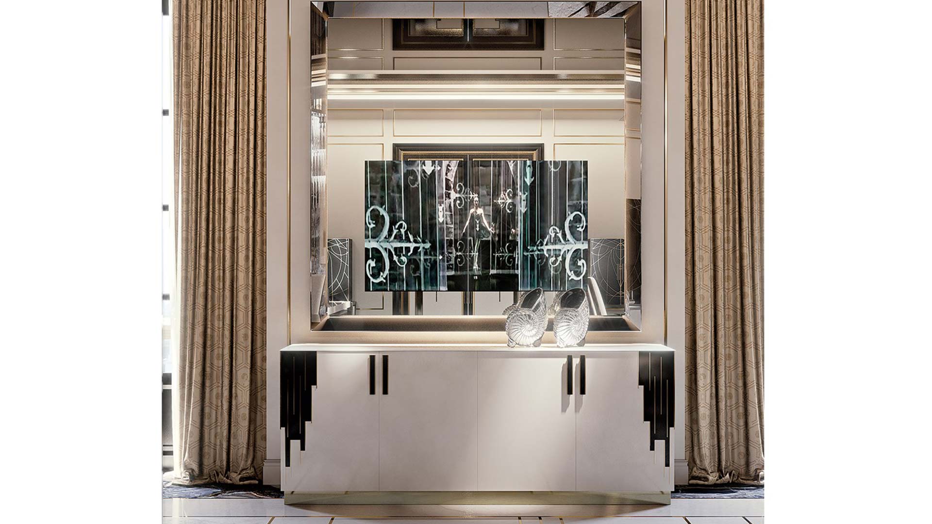 4-door buffet with glossy lacquered wood structure, contrasting decorative details, and satin gold-finish accents.