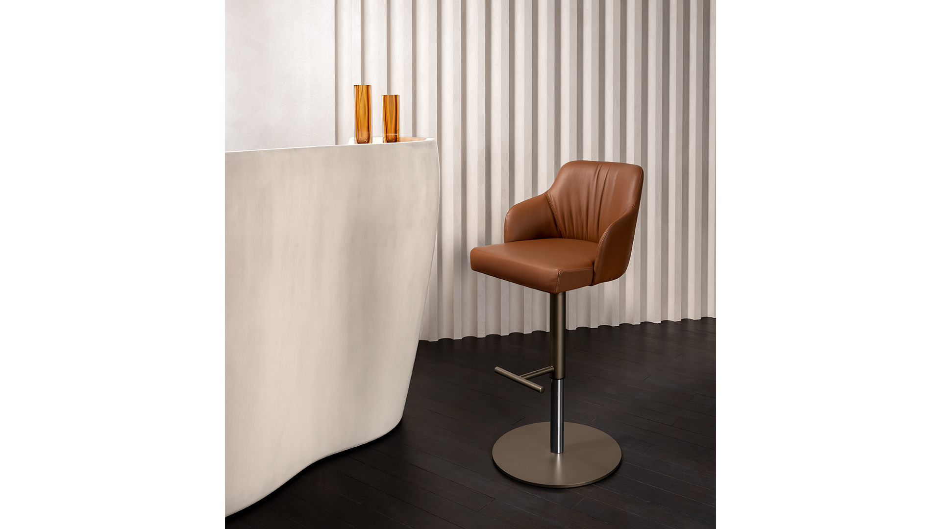 Stool with a wooden frame, upholstered seat and backrest. Height-adjustable base in Bronze finish (100M).