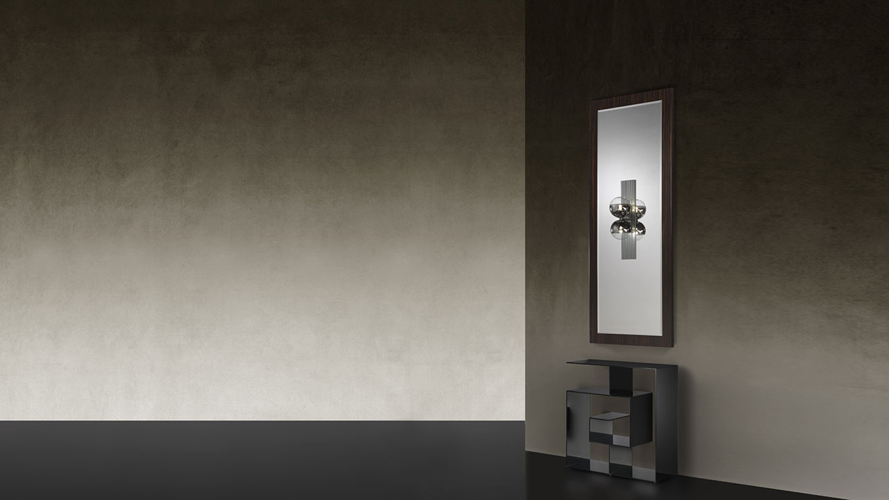 Mirror with an essential and contemporary language, characterized by a clean reflective surface and a textured frame that defines its perimeter. The beveled edge on the glass introduces a refined detail, while the frame in Marmoreflex or Legnoreflex allows for a direct dialogue with architectural materials and coordinated furnishings.