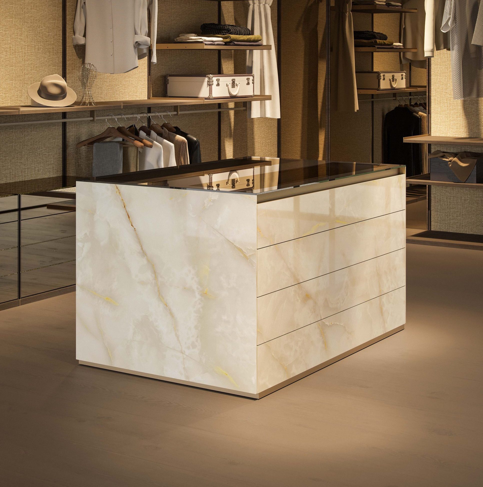 Island unit or 8-drawer chest with a solid, architectural volume, continuous glass covering, and metal details defining its perimeter. Designed to be central and visible from every side.