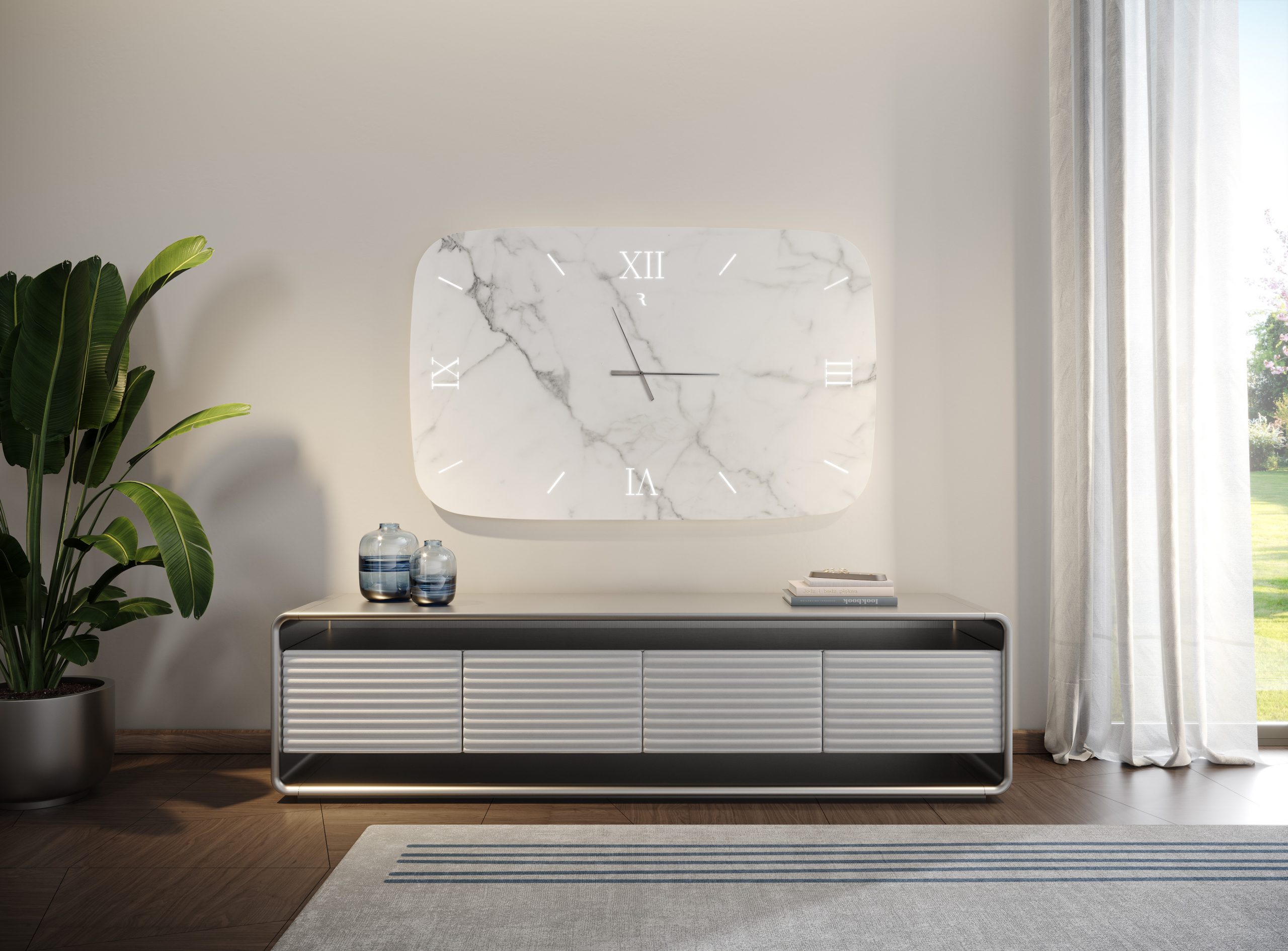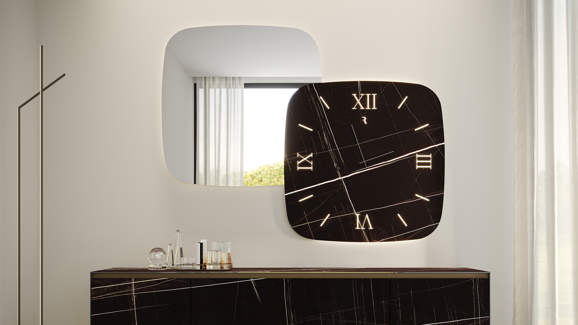 Decorative system composed of a clock and a coordinating mirror, designed as a graphic and architectural wall element. Nautilus works on the balance between textured surfaces and essential lines, adapting to both residential and contract settings.