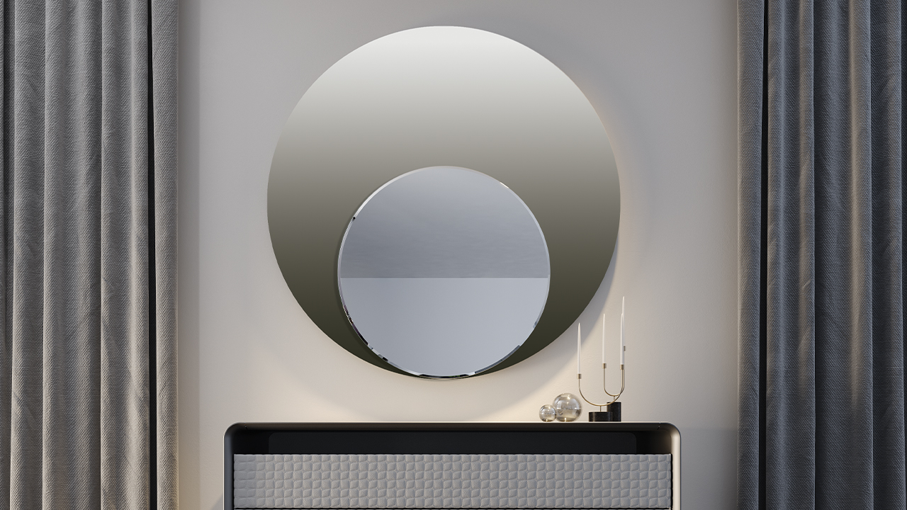 Decorative mirror featuring the combination of a Smoked Glass panel and a central round mirror in extra-clear glass. Nuance plays on the contrast between color depth and pure reflection, with a soft and contemporary design.