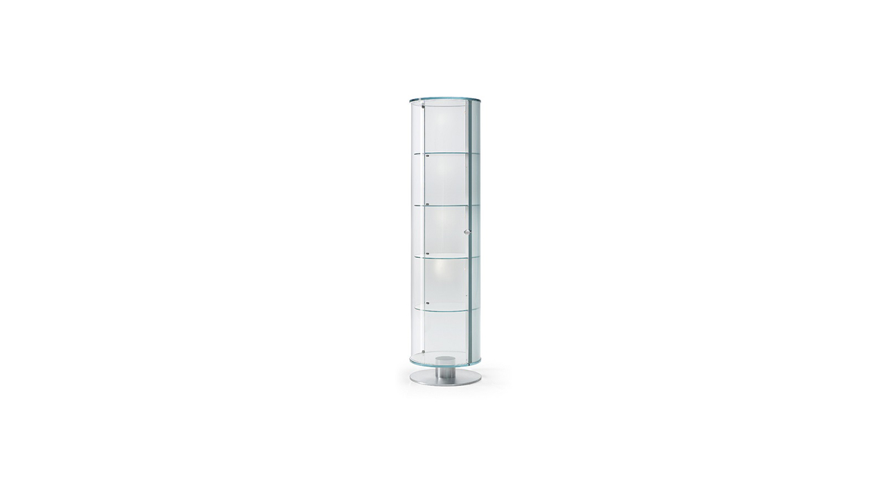 Cylindrical display cabinet in curved extra-clear glass with acid-etched back and door with lock.
