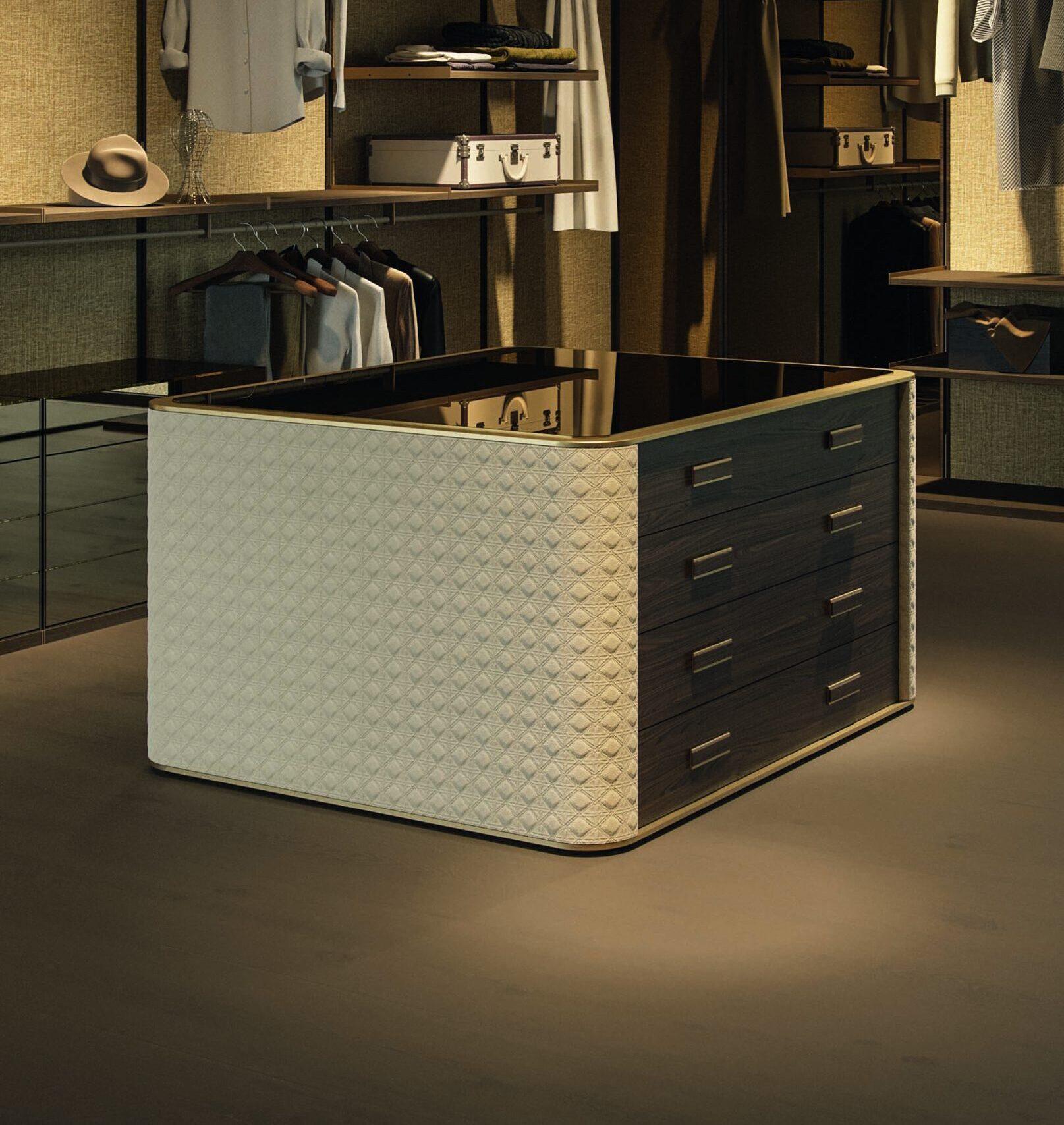 ing: Central storage element or island with eight drawers, characterized by a strong architectural presence and a balance between upholstered surfaces, wood, and decorated glass.