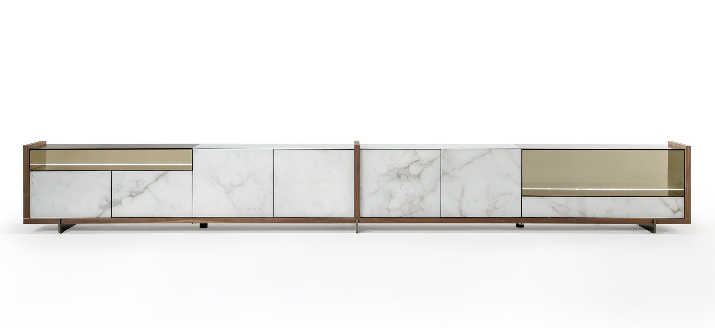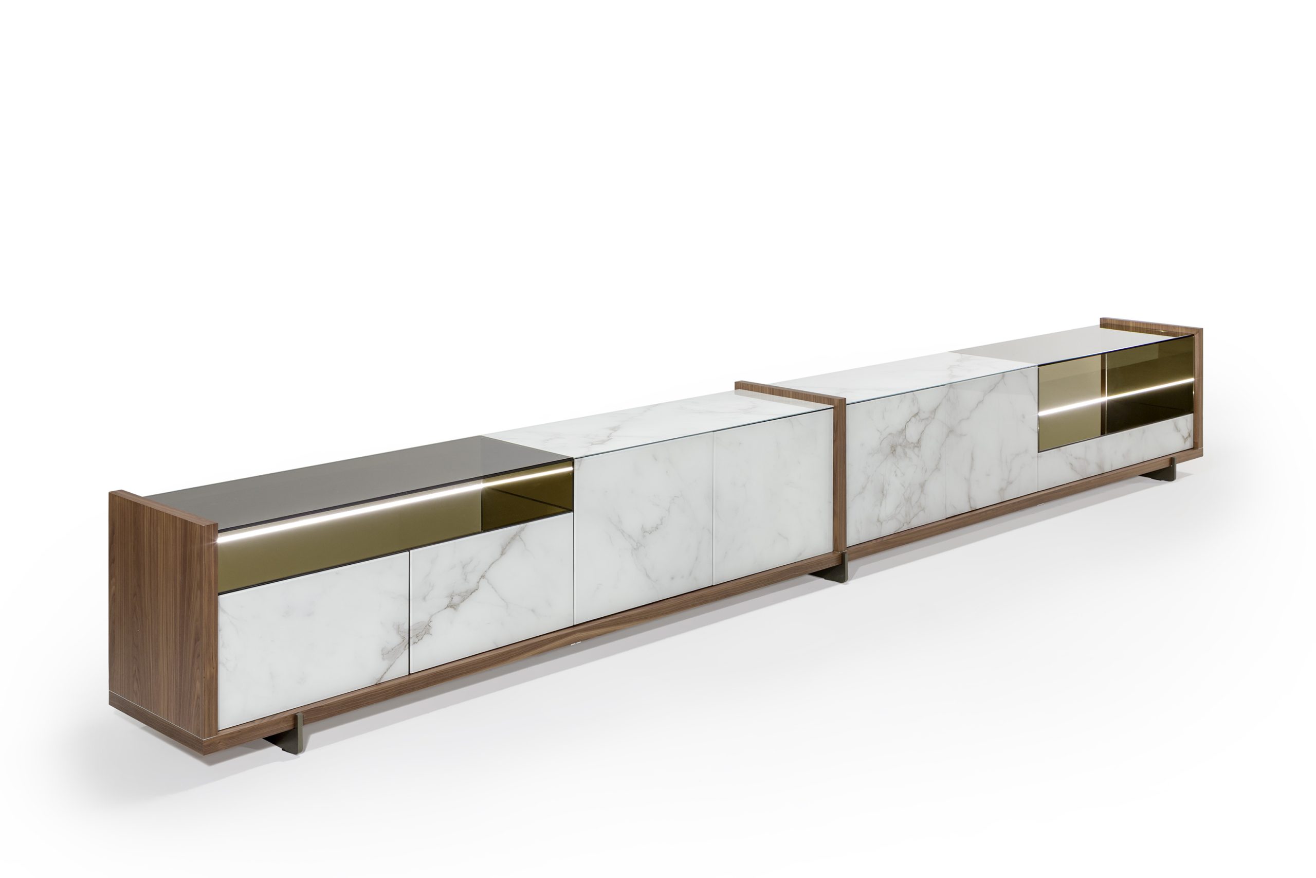 Modular system with wood structure. Metal feet in Bronze finish (100M). Doors and drawers in Marmoreflex or Legnoreflex. Glass display cases with LED lighting.