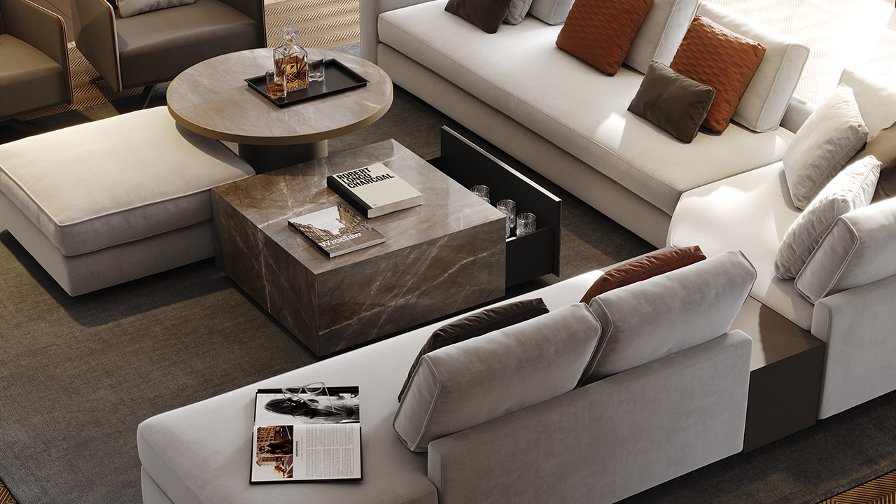 Sistema di tavolini da salotto e inserti per divano con struttura interna in legno e rivestimento esterno in pelle oppure in vetro.