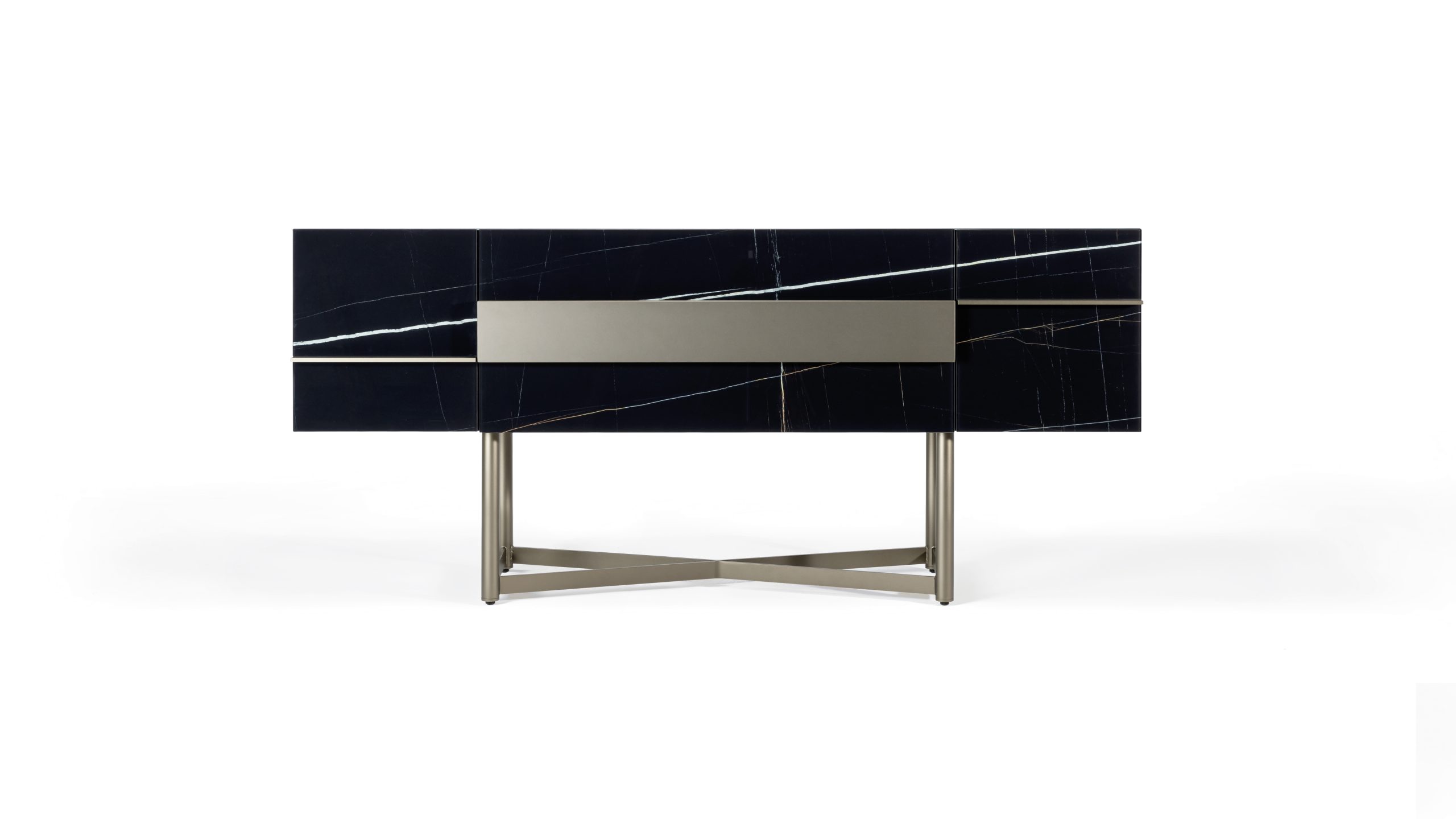 Buffet con struttura in legno rivestita in Marmoreflex o Legnoreflex, caratterizzato da dettagli metallici in finitura Bronze.
