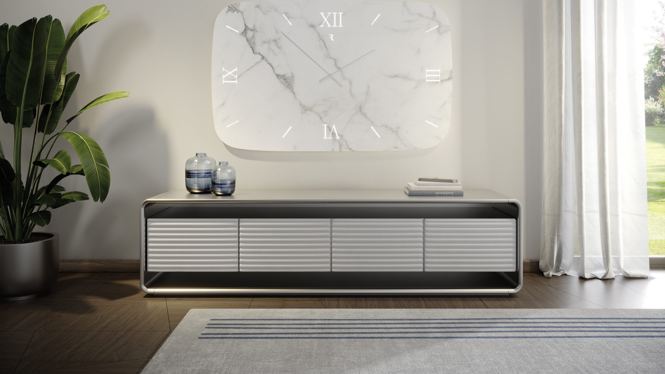 Buffet basso con struttura sagomata in legno e ante sospese rivestite in pelle trapuntata.