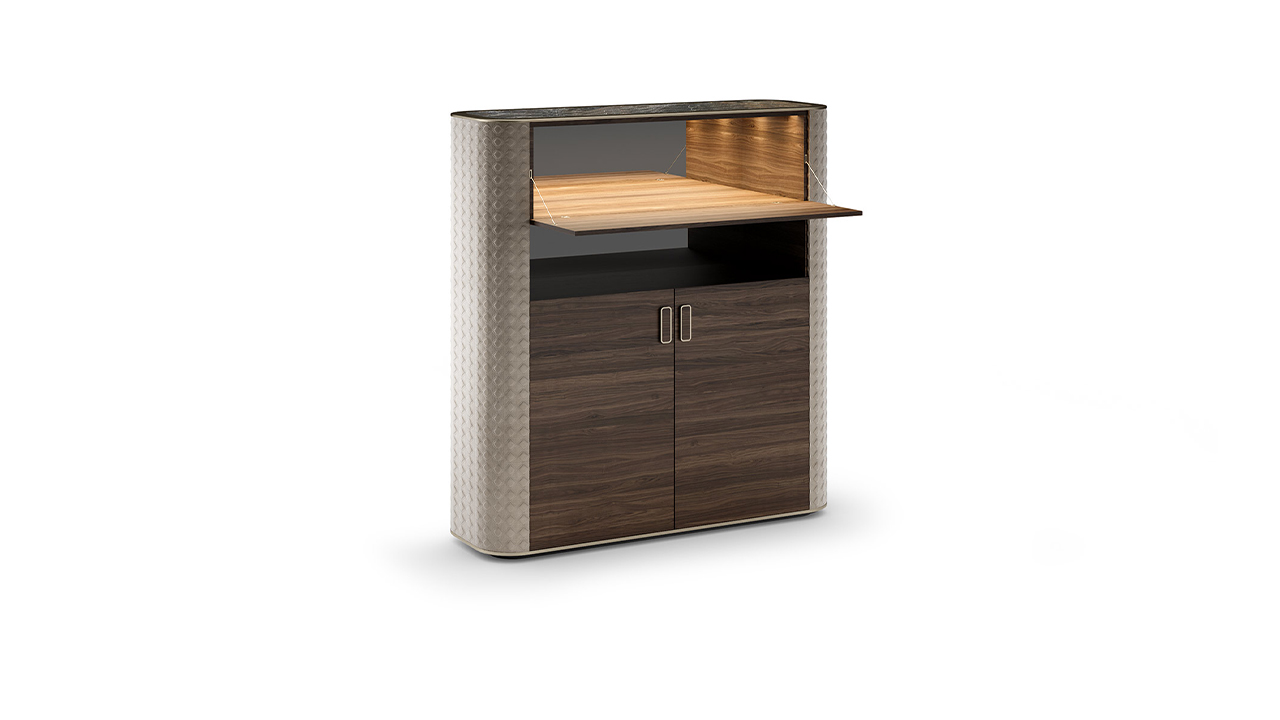 Madia con struttura in legno. Due ante con maniglia in ottone con dettaglio in legno, una ribalta con apertura push-pull e un vano a giorno. Fianchi rivestiti in pelle con trapuntatura. Top in Marmoreflex con profilo in finitura ottone (104M). Ripiani interni in vetro trasparente.