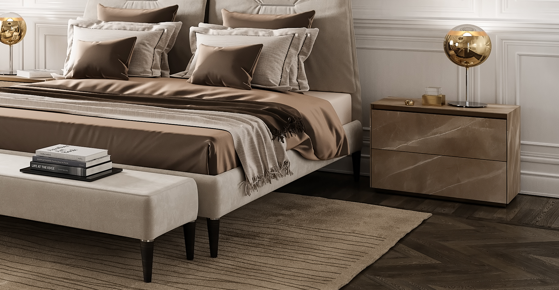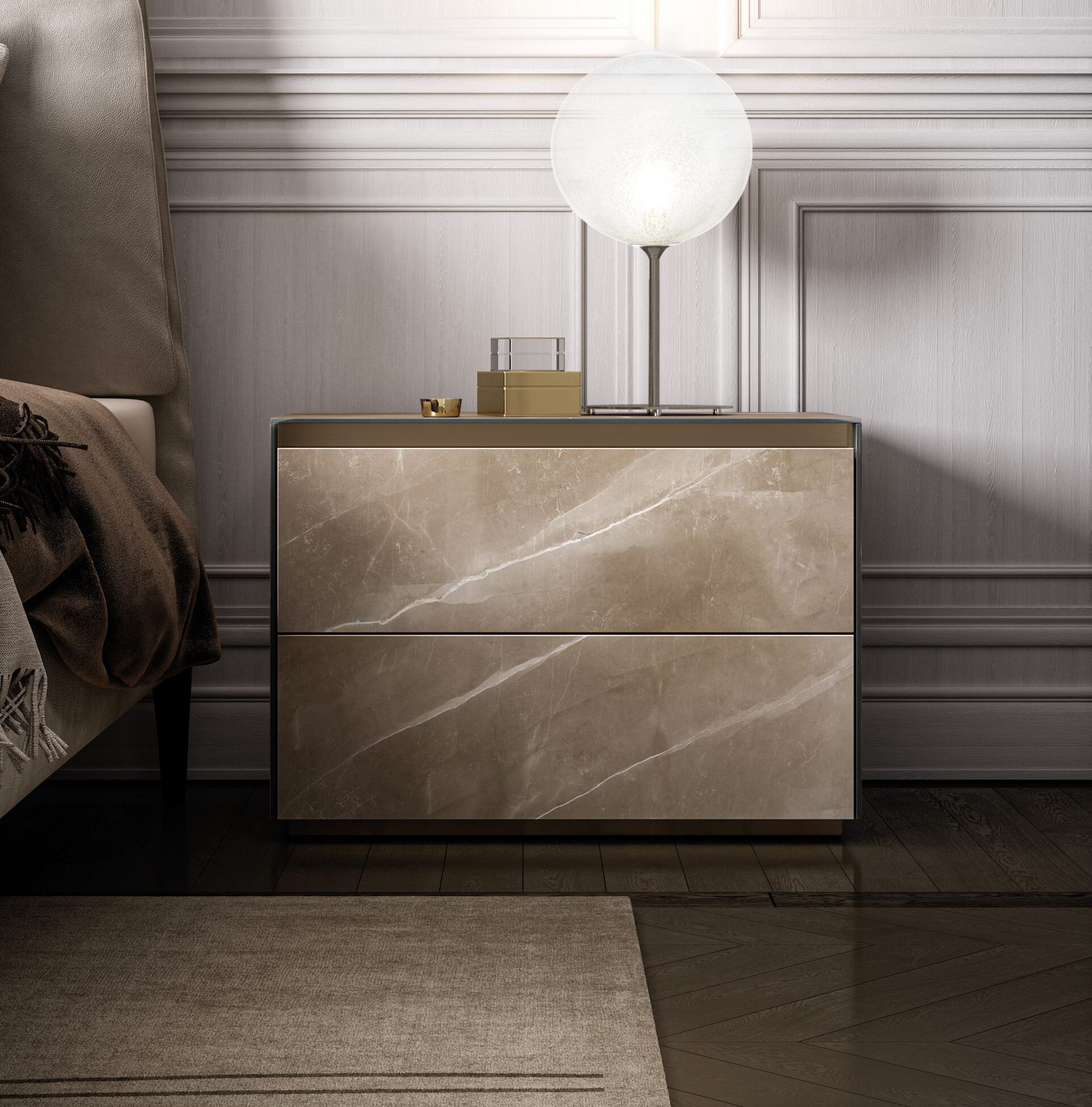 Comodino dalla presenza compatta e rigorosa, coerente con il linguaggio architettonico della famiglia Monolite, dove il volume pieno è enfatizzato dal rivestimento in vetro e dalla definizione metallica della base.