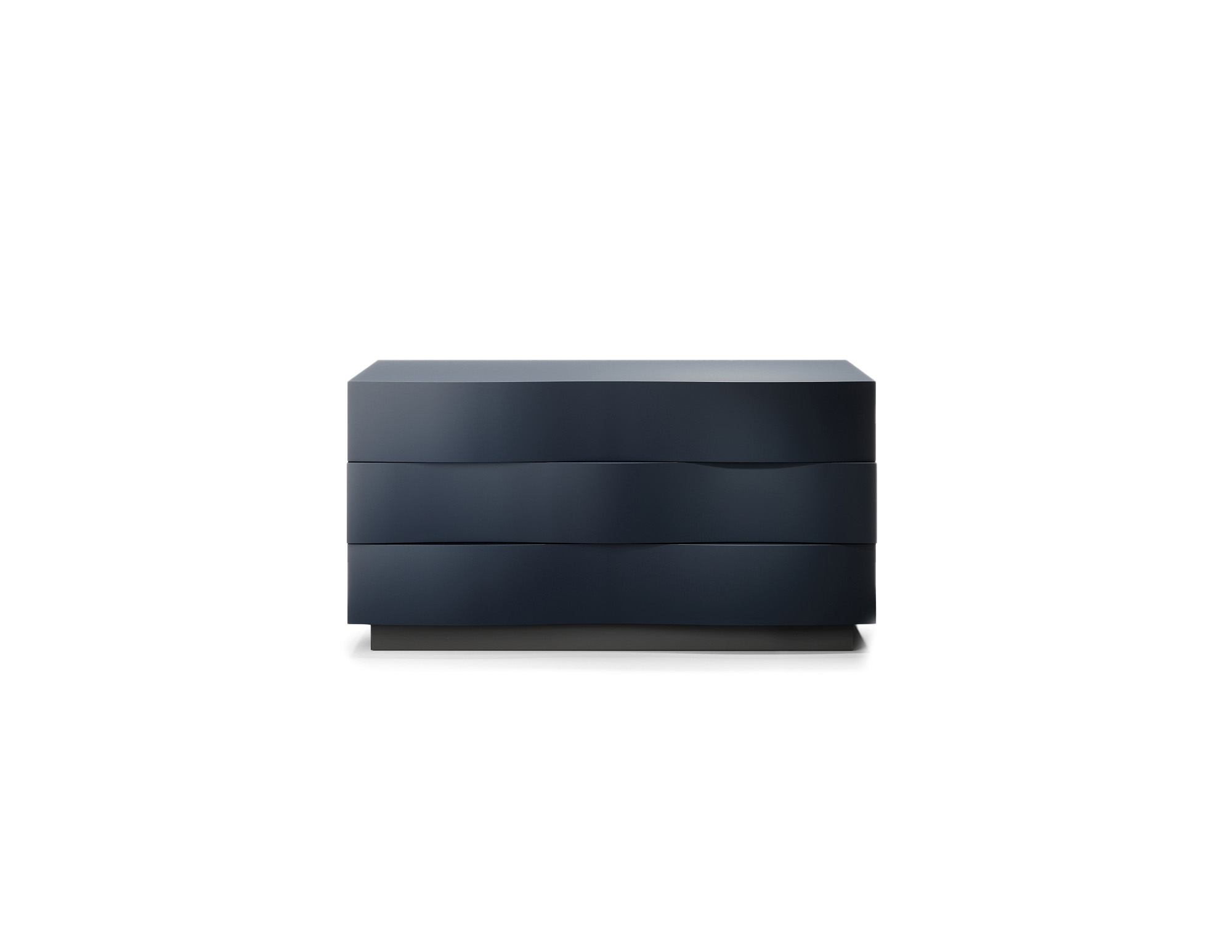 Comò caratterizzato da frontali cassetti sagomati, che definiscono un andamento fluido e continuo. Lo zoccolo laccato nero opaco introduce un elemento di contrasto grafico, rafforzando il disegno complessivo del volume.