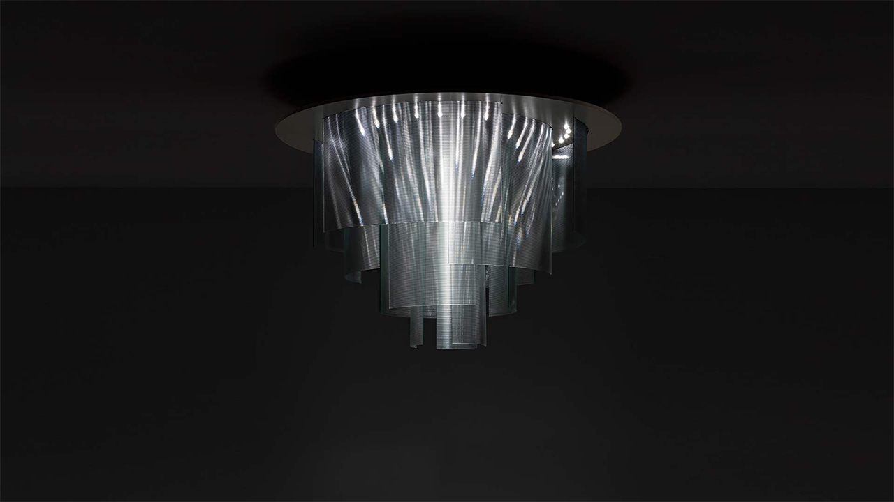 Lampadario scenografico composto da una cascata di elementi in vetro rigato curvato, disposti a diverse altezze per creare un effetto luminoso dinamico e tridimensionale. Il contrasto tra il vetro lavorato e i materiali strutturali enfatizza il carattere decorativo del prodotto.