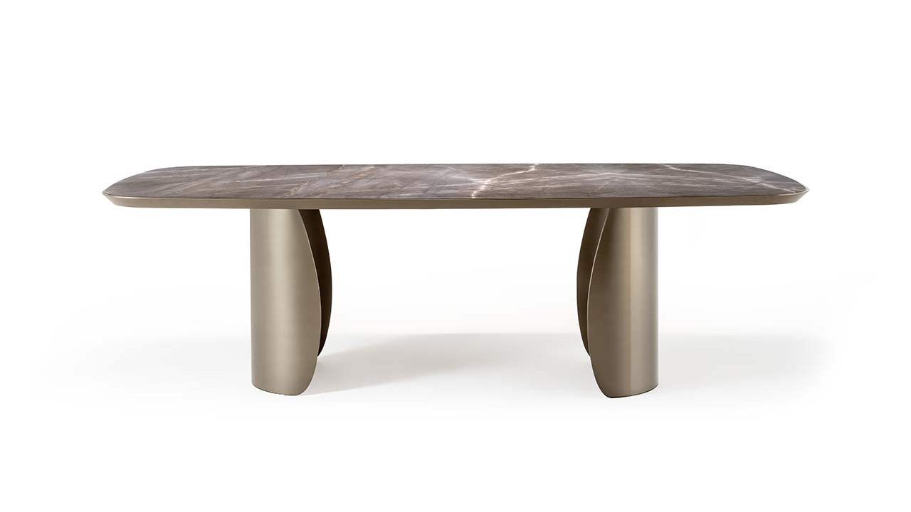Scrivania dal segno leggero e scultoreo, caratterizzata da basi in vetro curvato e da un piano importante Bevel Wood. Un progetto che gioca sul contrasto tra trasparenza strutturale e matericità del piano, mantenendo un’estetica elegante e contemporanea.