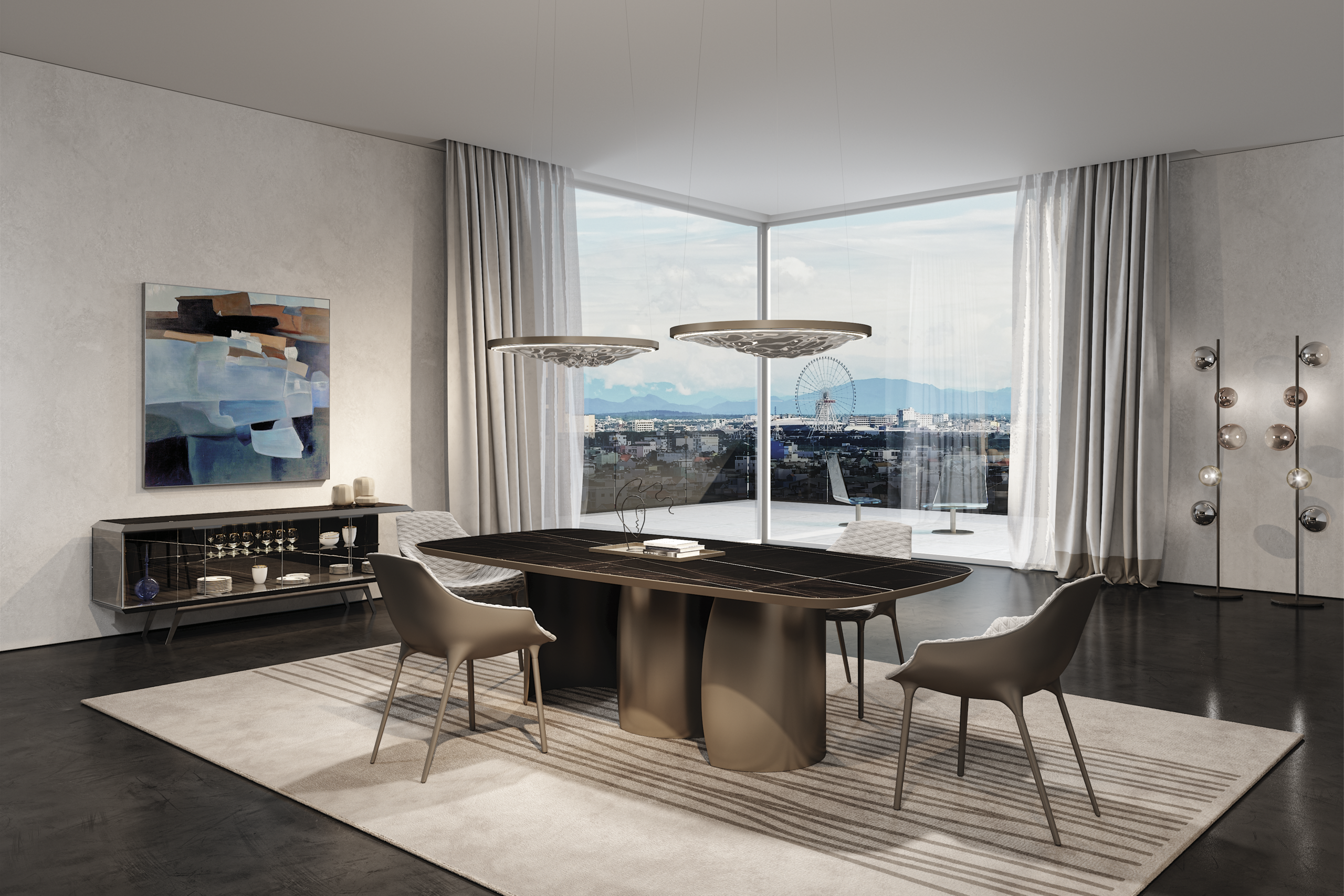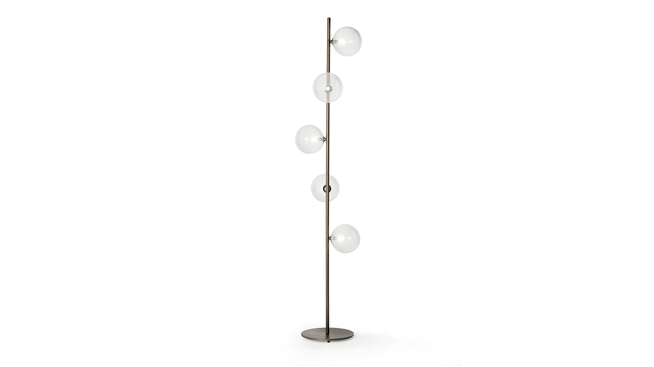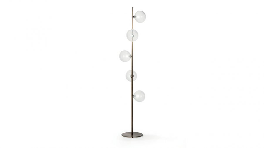Piantana da terra con struttura portante in metallo, caratterizzata da un disegno verticale essenziale che valorizza la composizione luminosa a sfere. L’equilibrio tra la finitura Bronze (100M) della struttura e la leggerezza del vetro rende il prodotto adatto sia ad ambienti residenziali eleganti sia a spazi contract di rappresentanza.