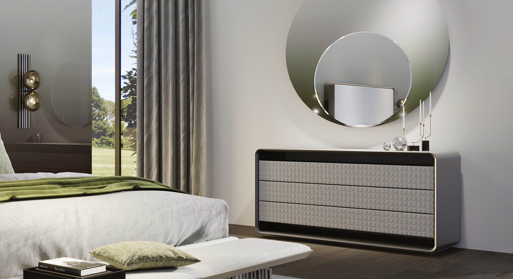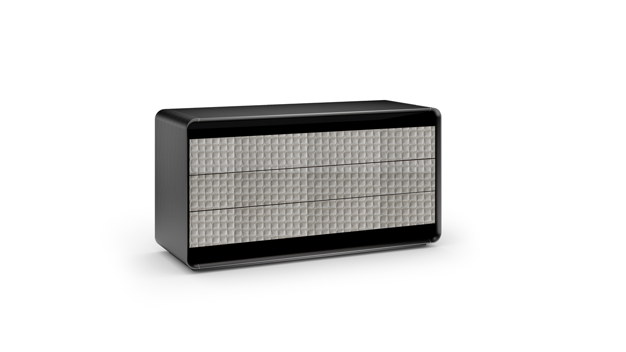 Comò a tre cassetti dal linguaggio morbido e sartoriale, caratterizzato da una struttura sagomata in legno e da frontali rivestiti in pelle trapuntata, che introducono una forte componente materica e decorativa.