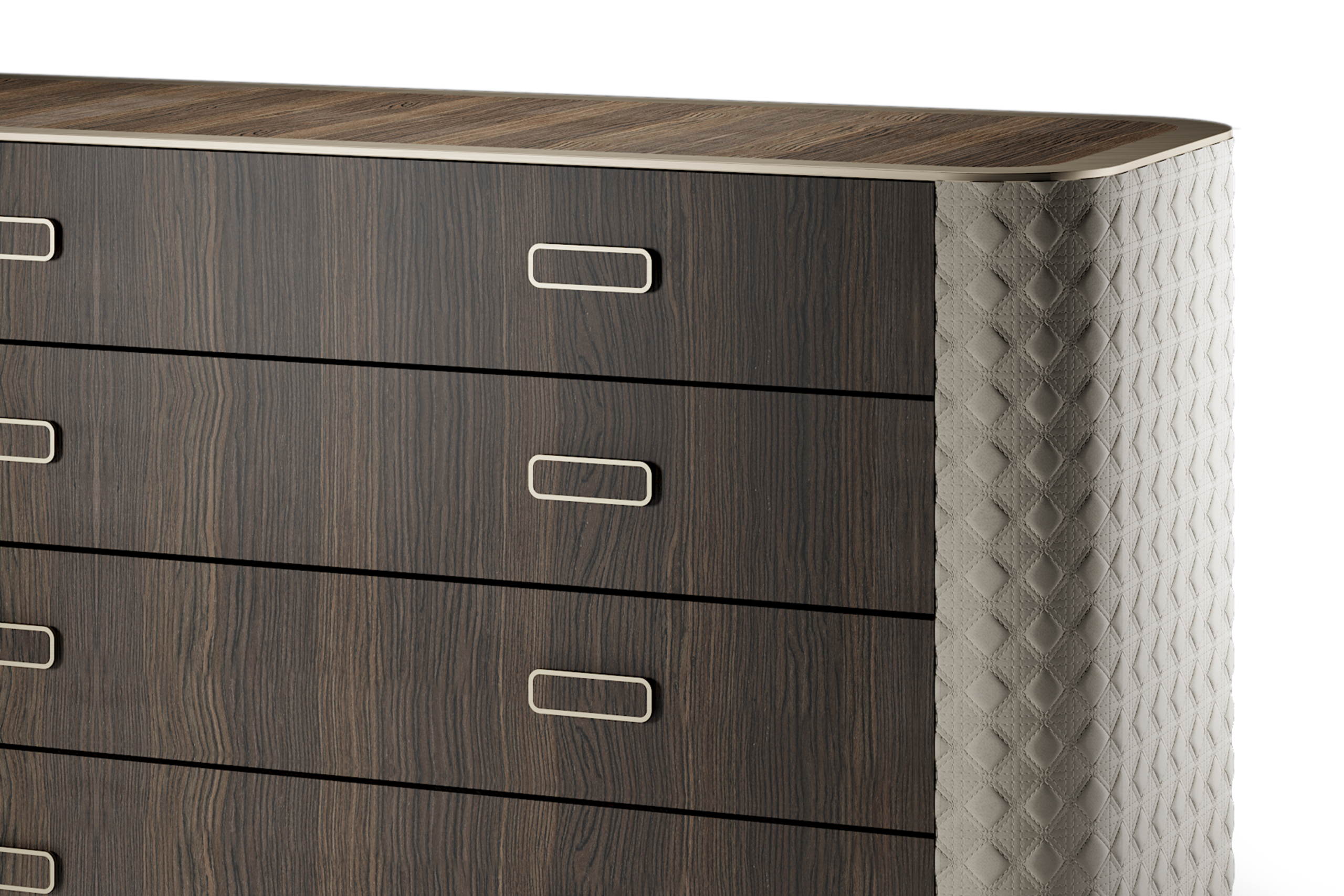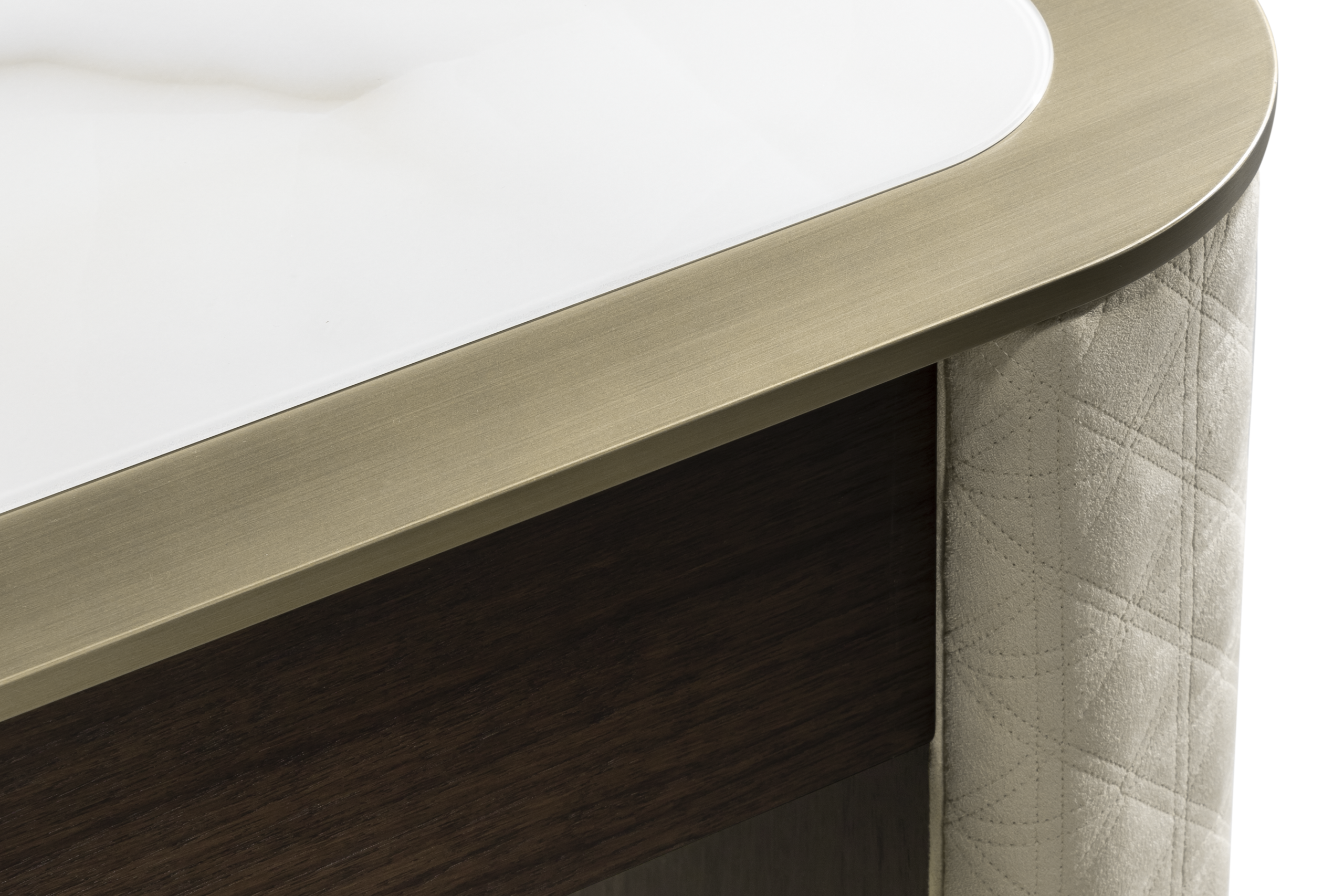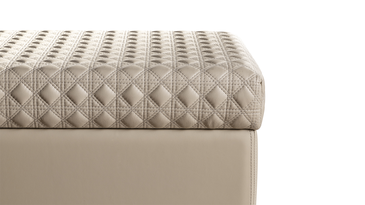 Letto con testiera alta imbottita e giroletto rivestiti in tessuto o pelle. La testiera è caratterizzata da trapuntatura decorativa, con giunzioni strutturali in legno laccato lucido Nero Beluga che ne definiscono il segno estetico. Rete ortopedica non compresa.