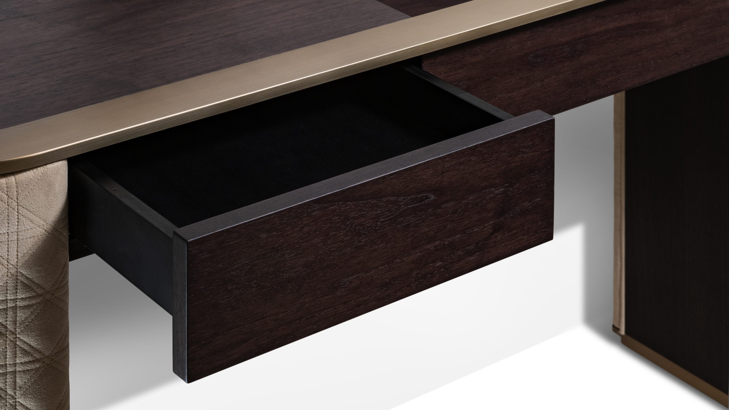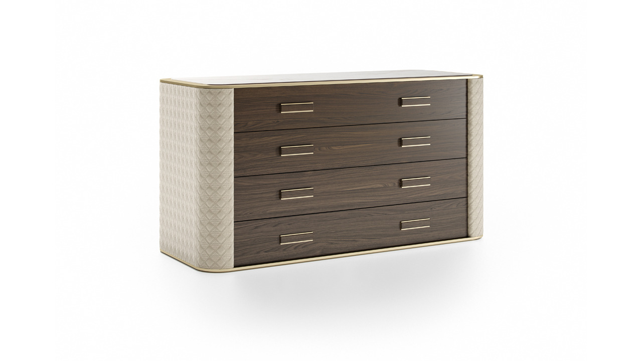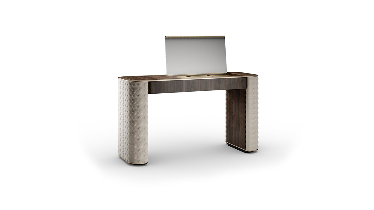 Letto con testiera alta imbottita e giroletto rivestiti in tessuto o pelle. La testiera è caratterizzata da trapuntatura decorativa, con giunzioni strutturali in legno laccato lucido Nero Beluga che ne definiscono il segno estetico. Rete ortopedica non compresa.