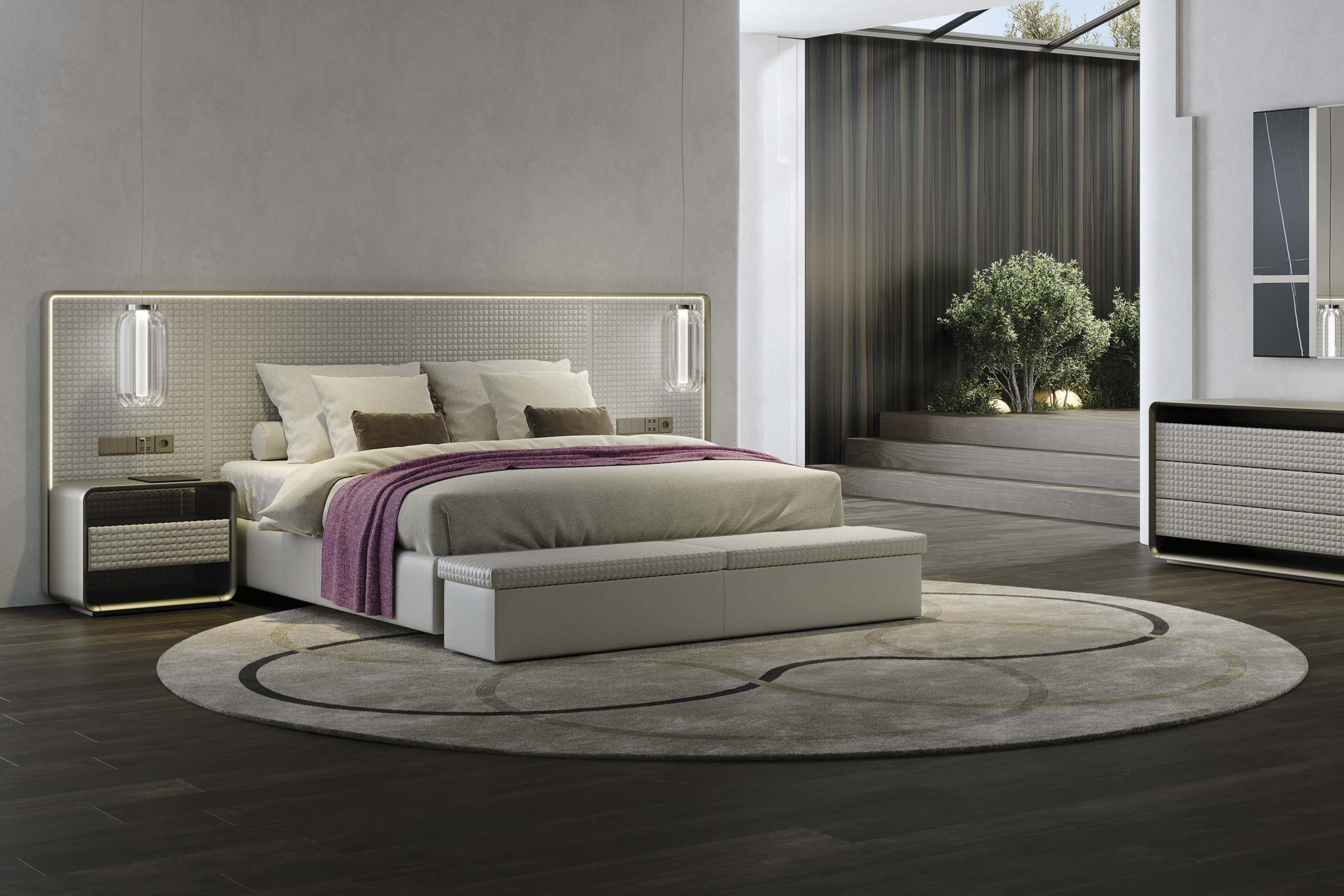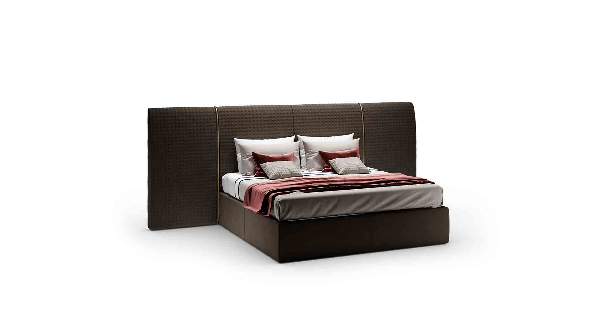 Letto con testiera alta imbottita e giroletto rivestiti in tessuto o pelle. La testiera è caratterizzata da trapuntatura decorativa, con giunzioni strutturali in legno laccato lucido Nero Beluga che ne definiscono il segno estetico. Rete ortopedica non compresa.
