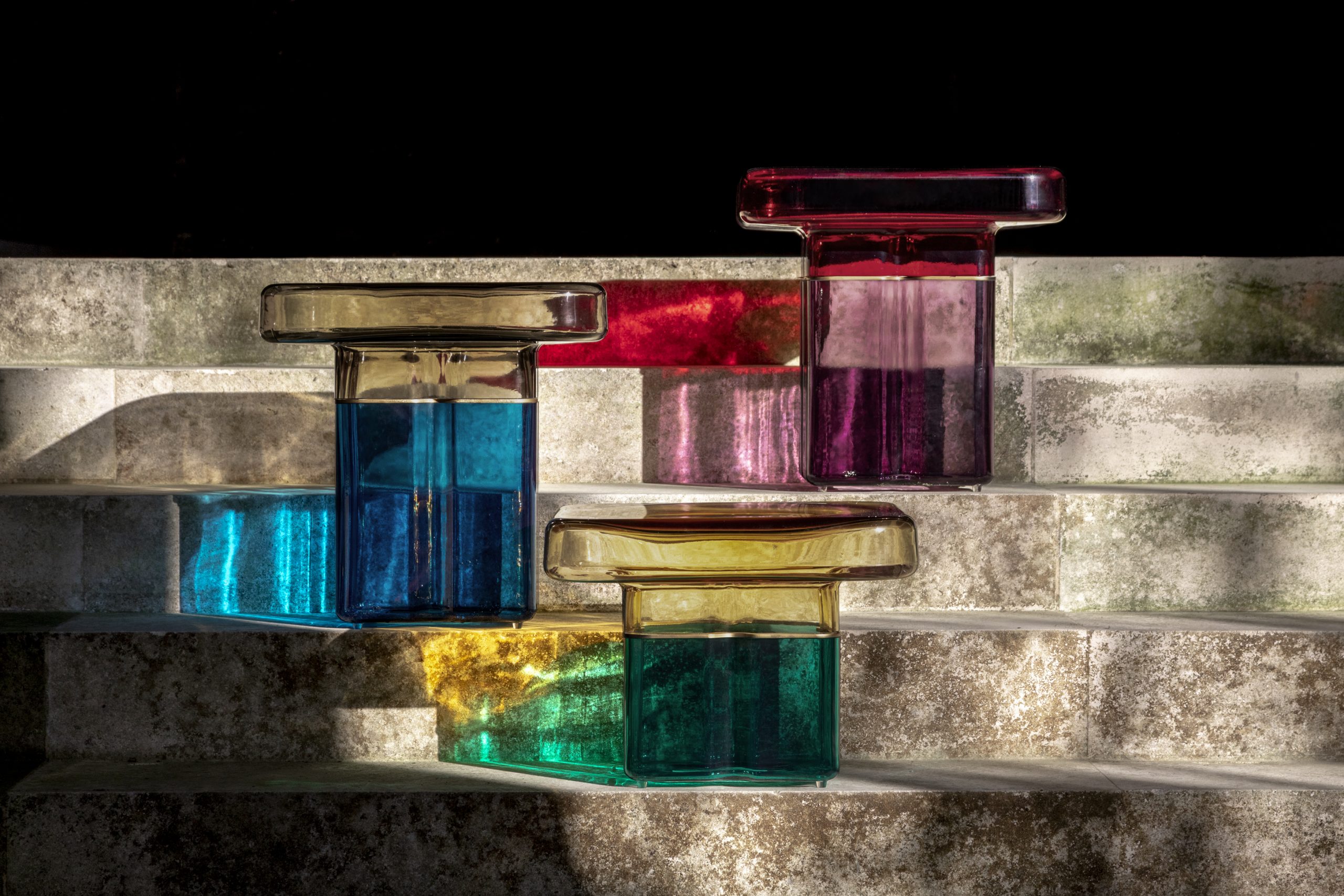 Tavolino centrale e terminale con basamento in vetro di Murano trasparente, blu-grigio, cioccolato o tabacco e supporto in ottone satinato. Piano in specchio bronzo oppure in vetro extrachiaro acidato per la versione con luce LED interna.