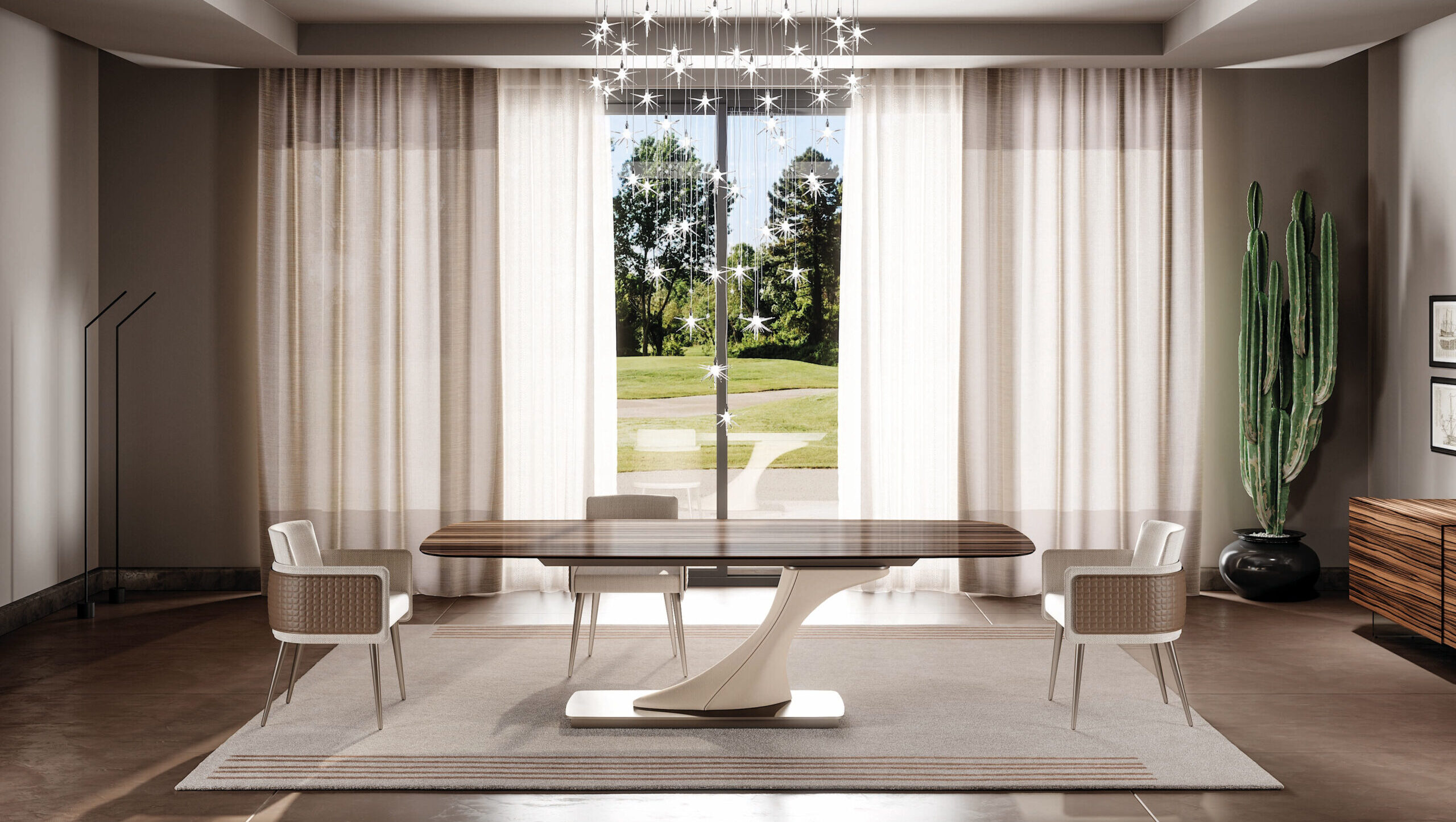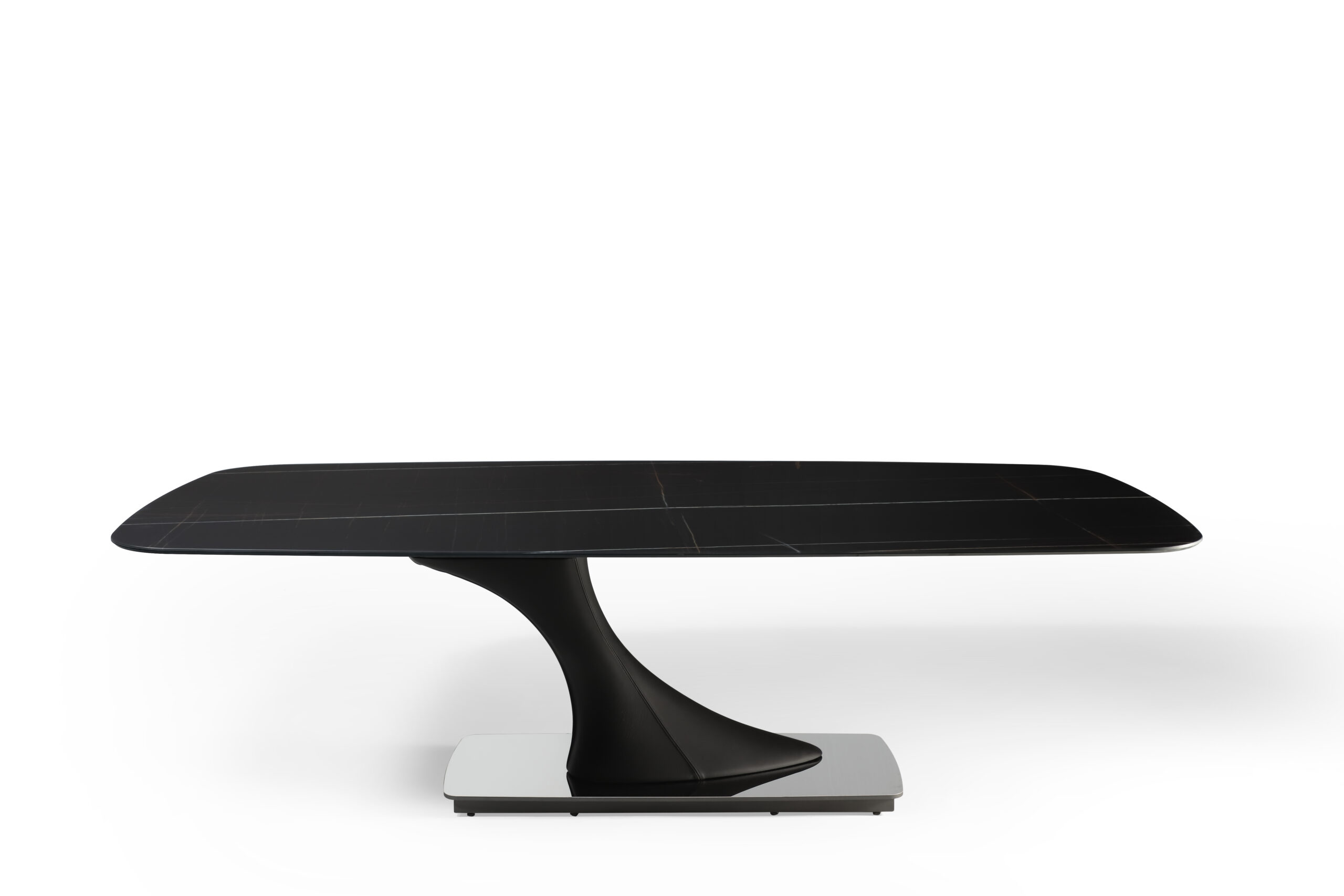 Tavolo da pranzo con gambe rivestite in pelle e struttura con piastra in metallo.