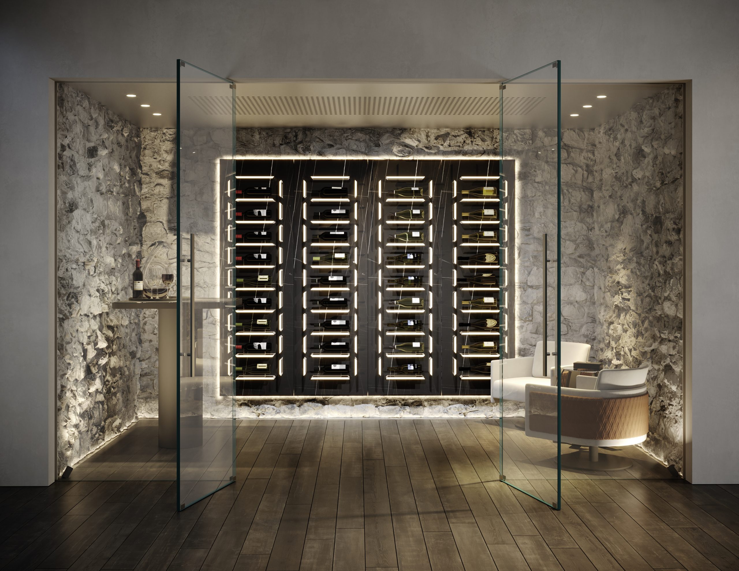 Sistema espositivo elegante e minimale, pensato per valorizzare bottiglie e oggetti con un forte impatto scenografico. Aurora unisce materiali riflettenti, luce e leggerezza visiva, trasformando la cantina in un vero elemento d’arredo.