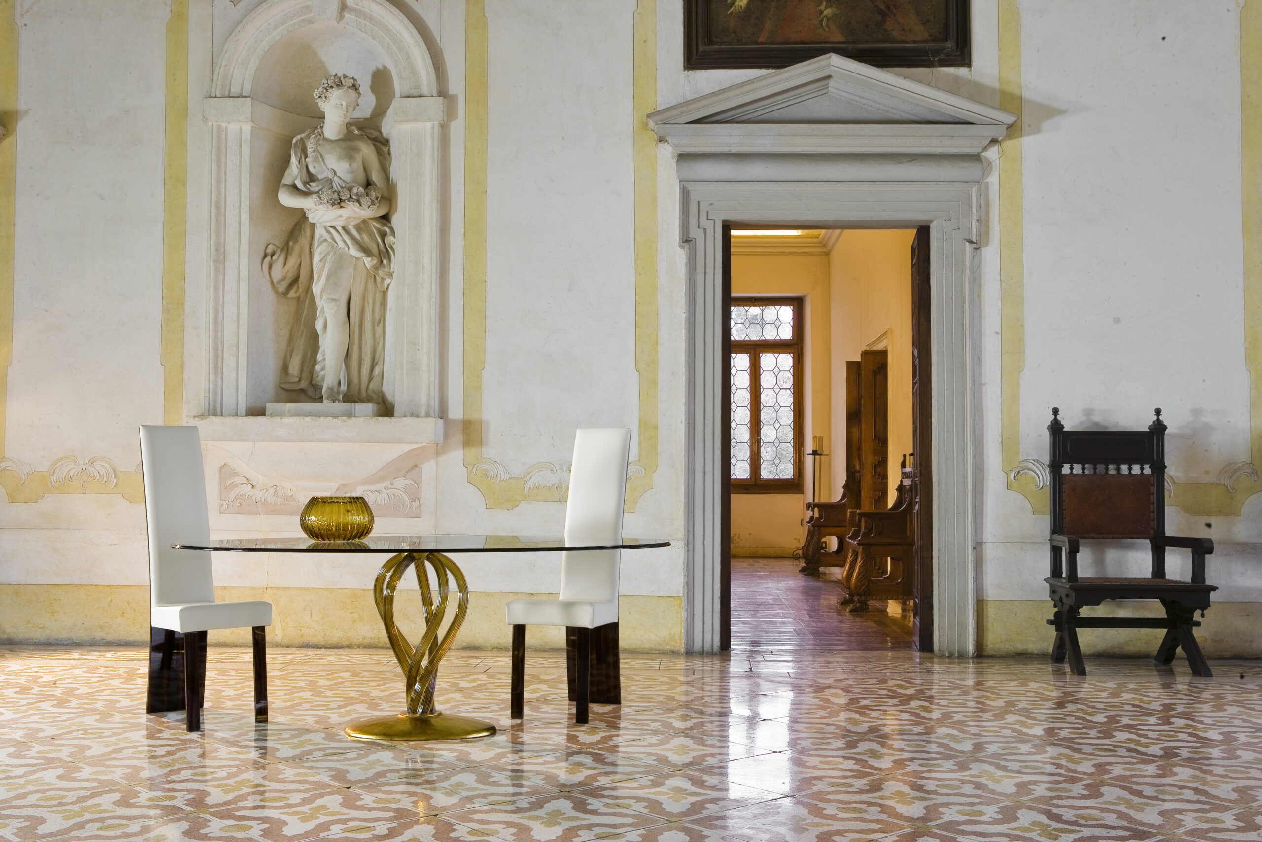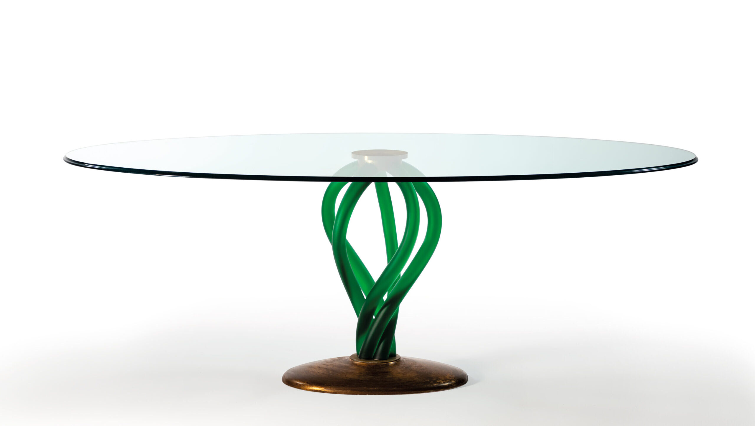 Tavolo da pranzo con base in vetro di Murano sabbiato e supporti con zoccolo a foglia.