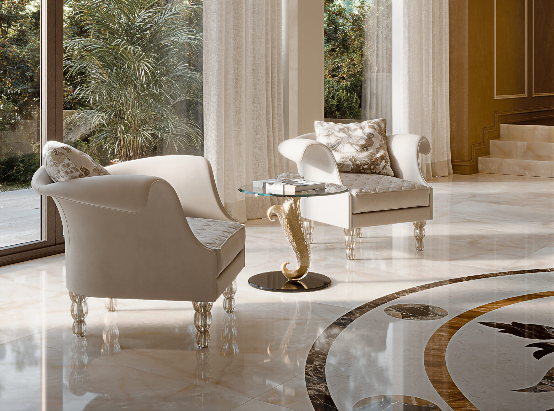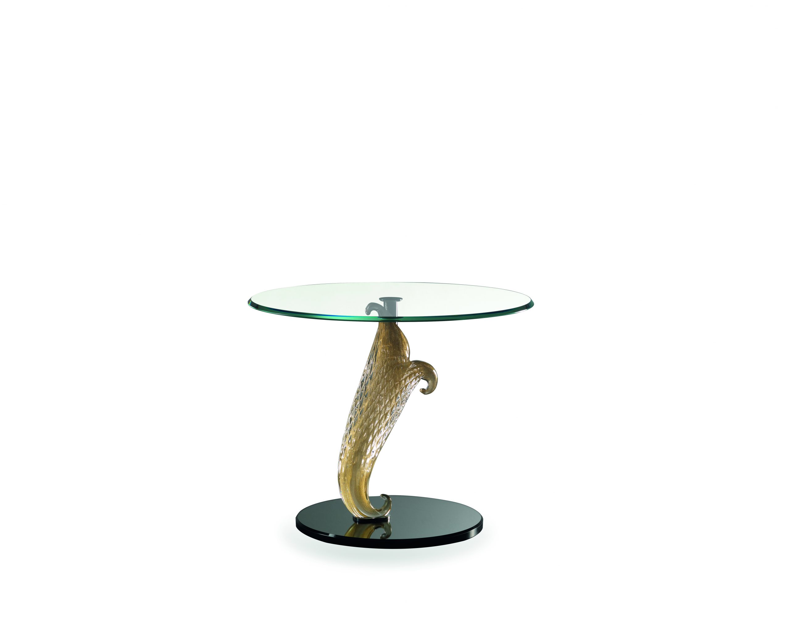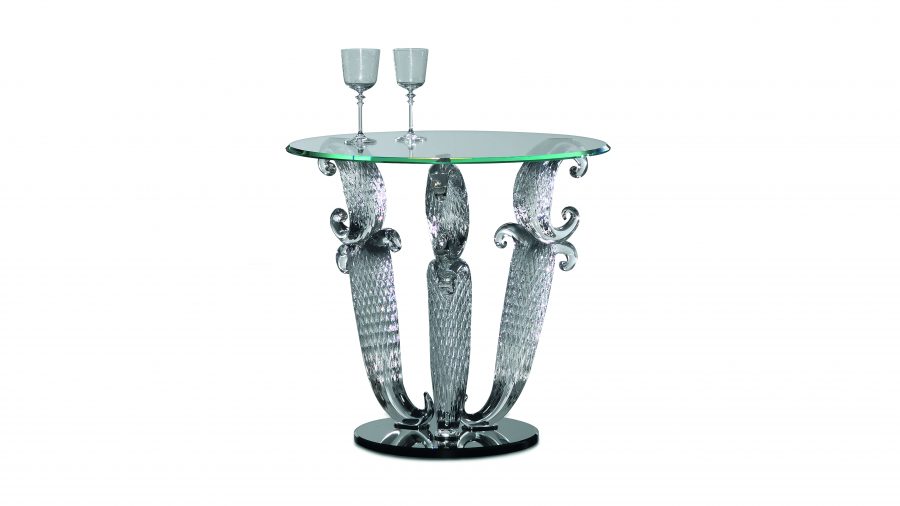 Casanova 55 in versione special con base composta da tre gambe in vetro di Murano trasparente o oro zecchino e zoccolo in vetro verniciato nero, con piano in vetro.