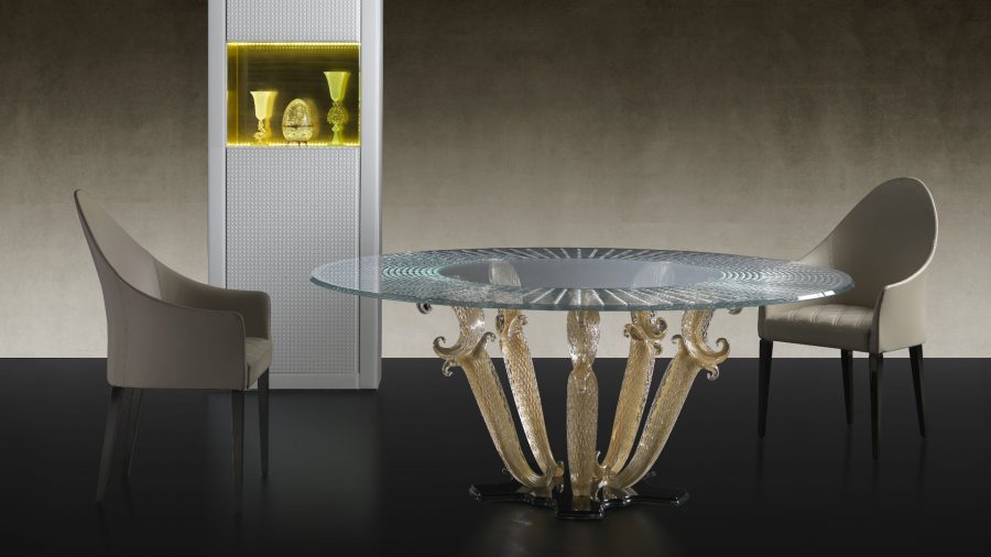 Versione con base a 5 gambe in oro zecchino con piano in cristallo con incisioni Diamante.