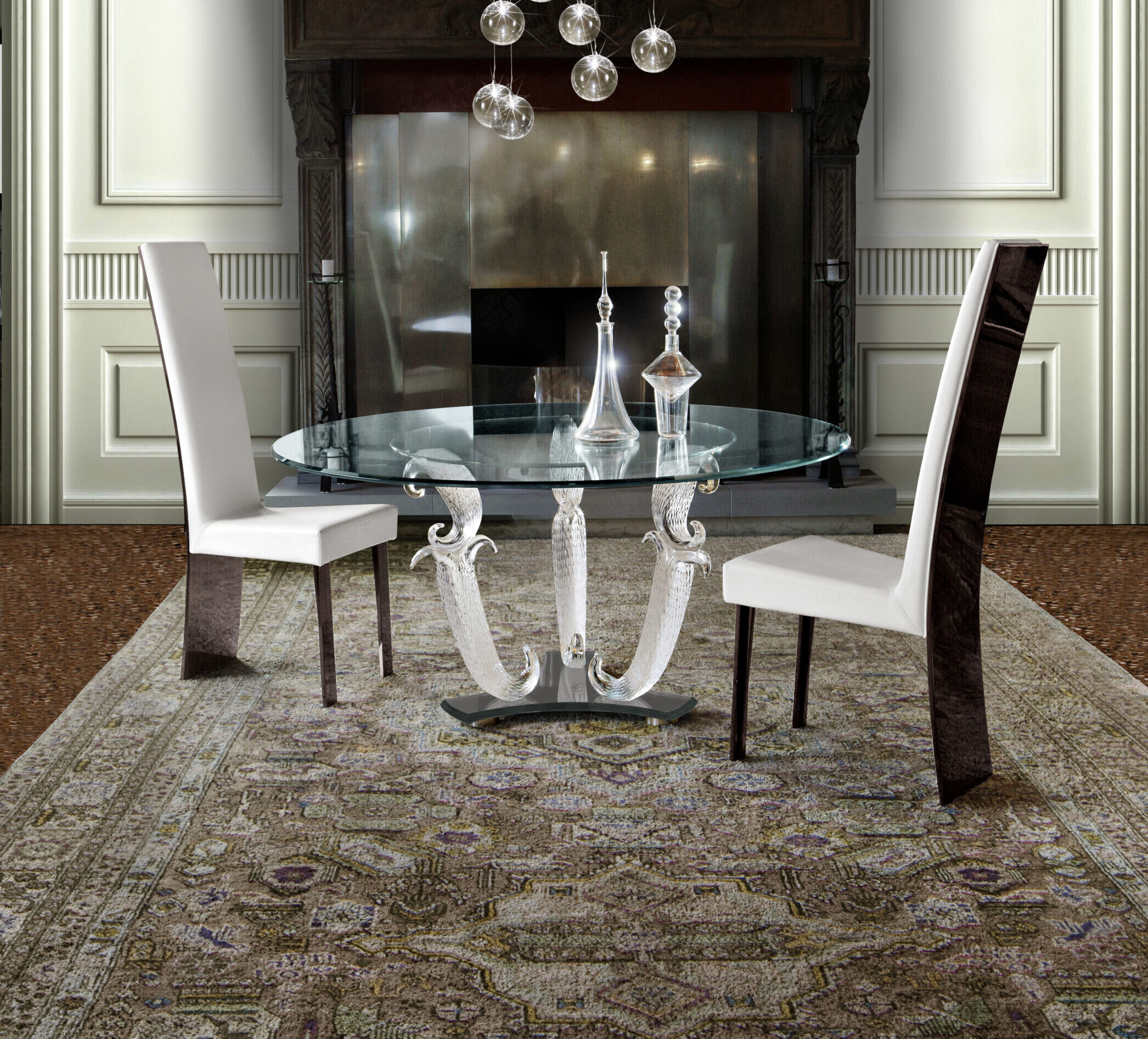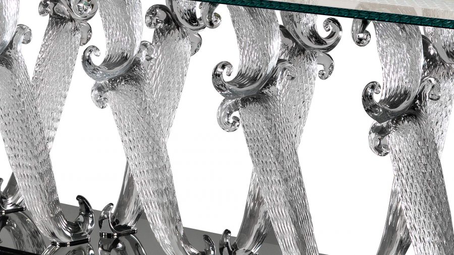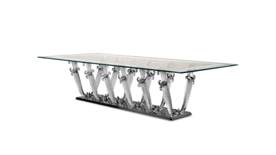 Tavolo da pranzo con base composta da gambe in vetro di Murano lavorate a mano, disponibile nelle finiture trasparente o oro zecchino. Zoccolo unico in vetro nero. Piano in vetro extrachiaro spessore 15mm con bisello 45° con fascia perimetrale con incisioni Bohème opzionale.