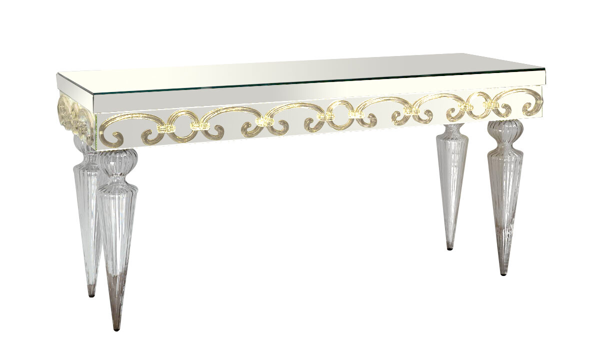 Console con struttura in legno rivestita in specchio extrachiaro, decori C e O in vetro di Murano su frontale e fianchi e gambe in vetro di Murano.
