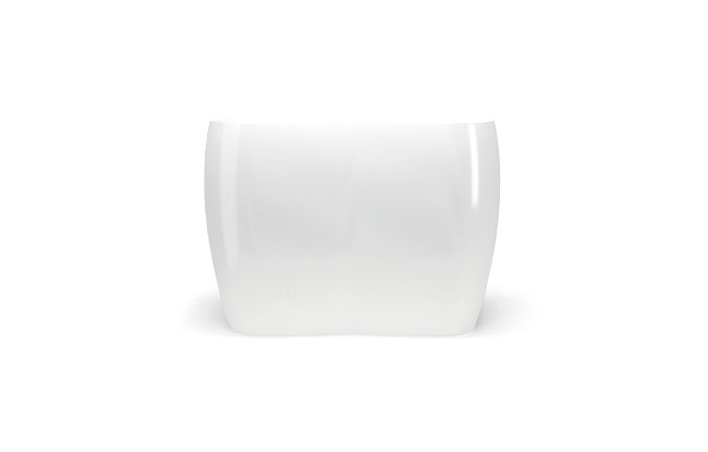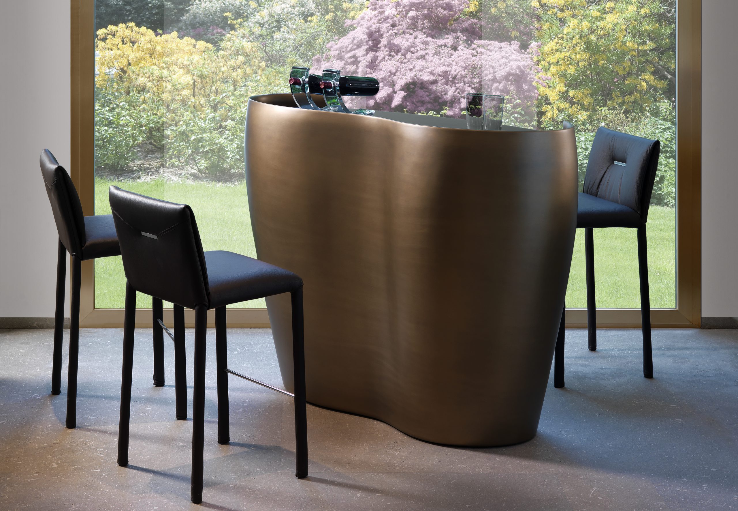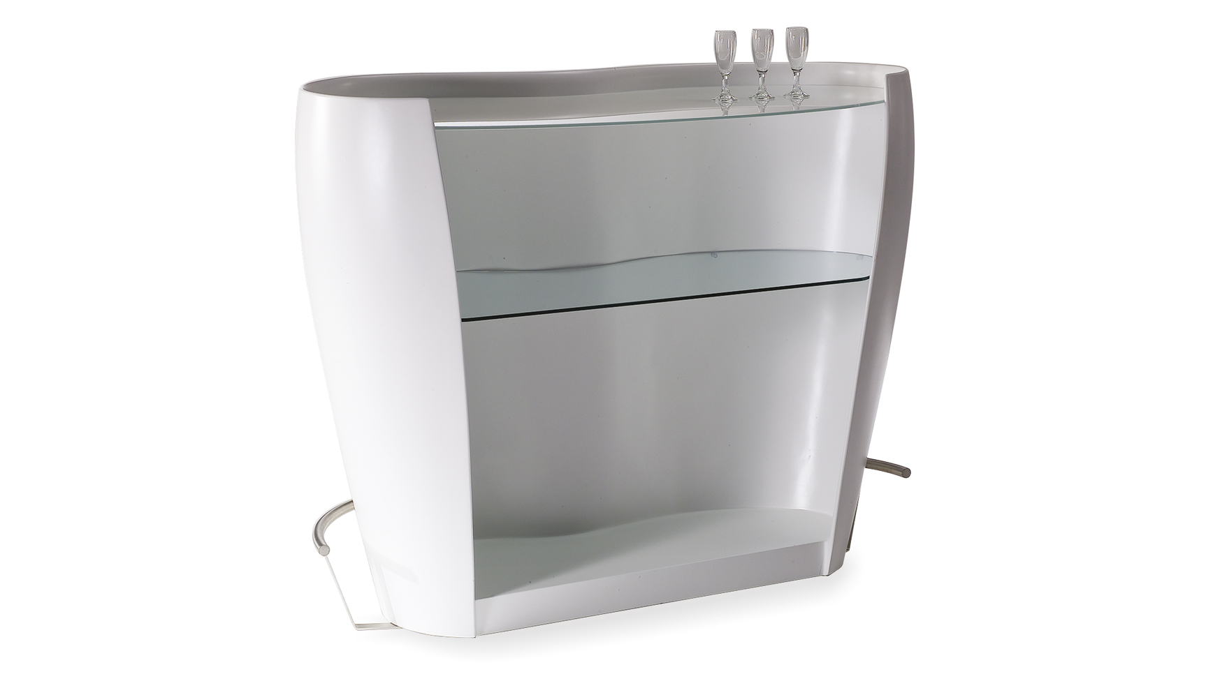 Bar sagomato con piano superiore in vetro verniciato in tinta e ripiano interno in vetro trasparente.
