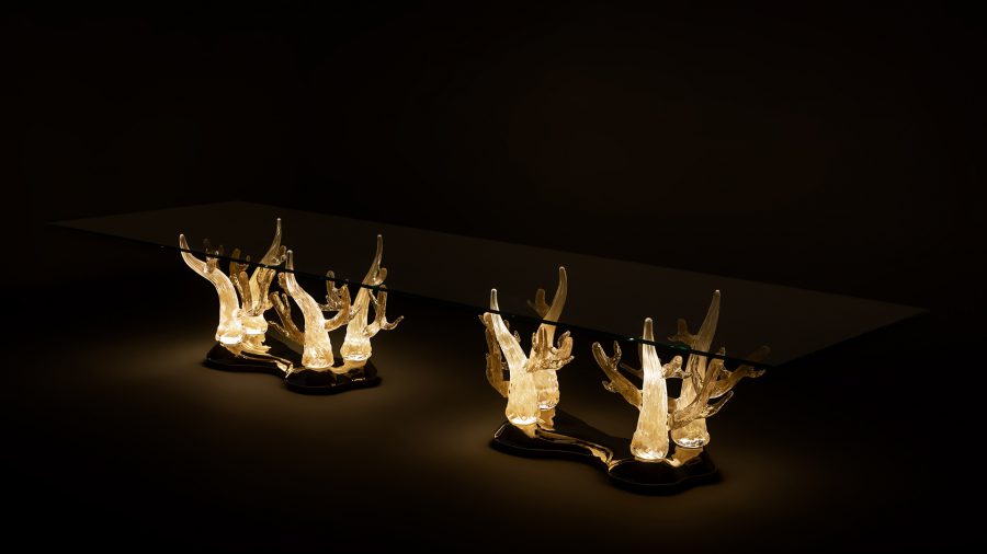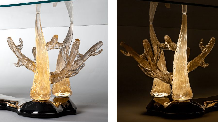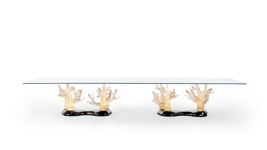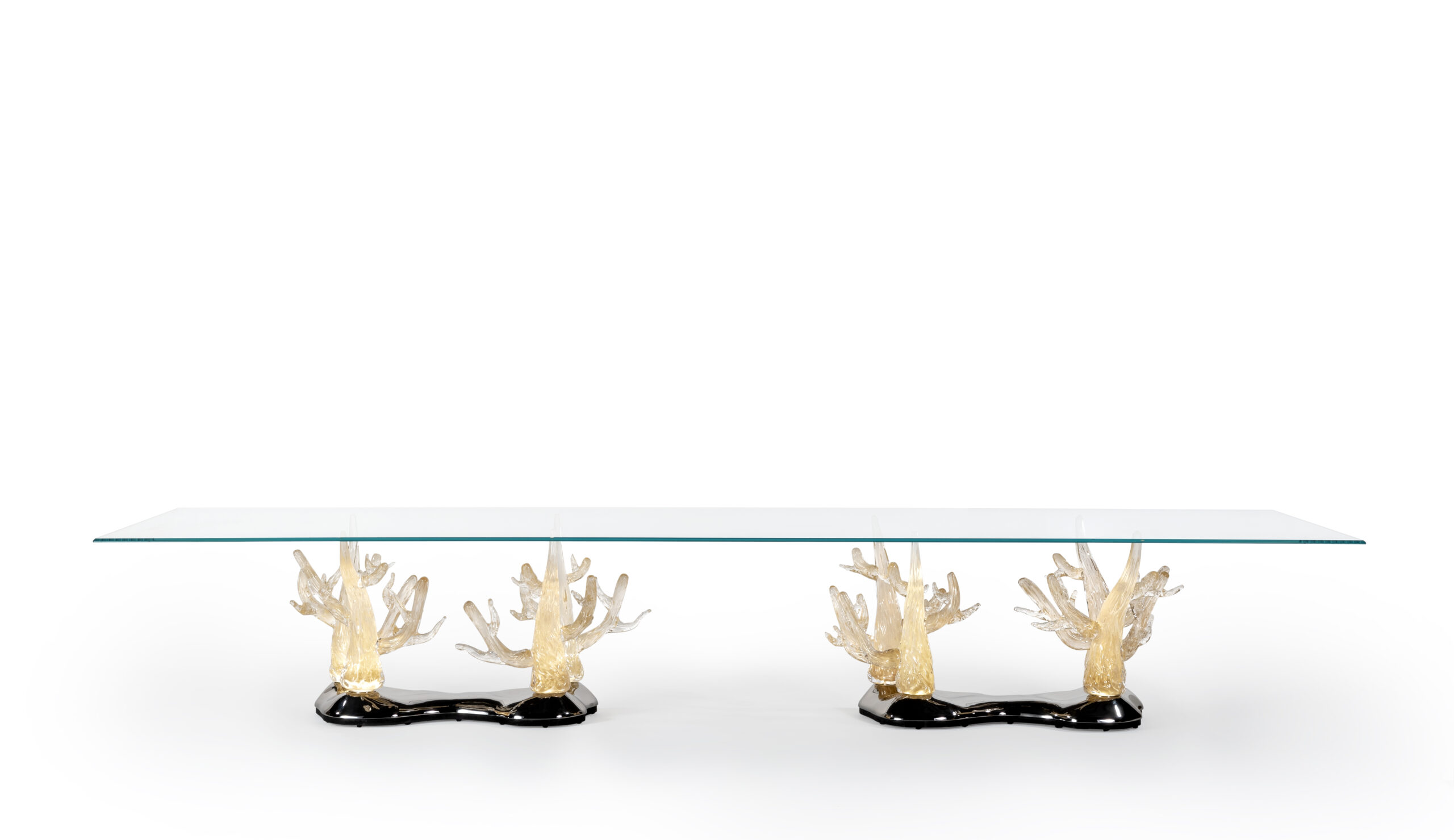 Tavolo da pranzo con basamento in vetro di Murano oro lavorato a mano. Zoccolo in finitura cromo con impianto luce Led. Piano in vetro extrachiaro spessore 15 mm con bisello 45°. Dimensione su misura: 470 x 140 x 77h cm