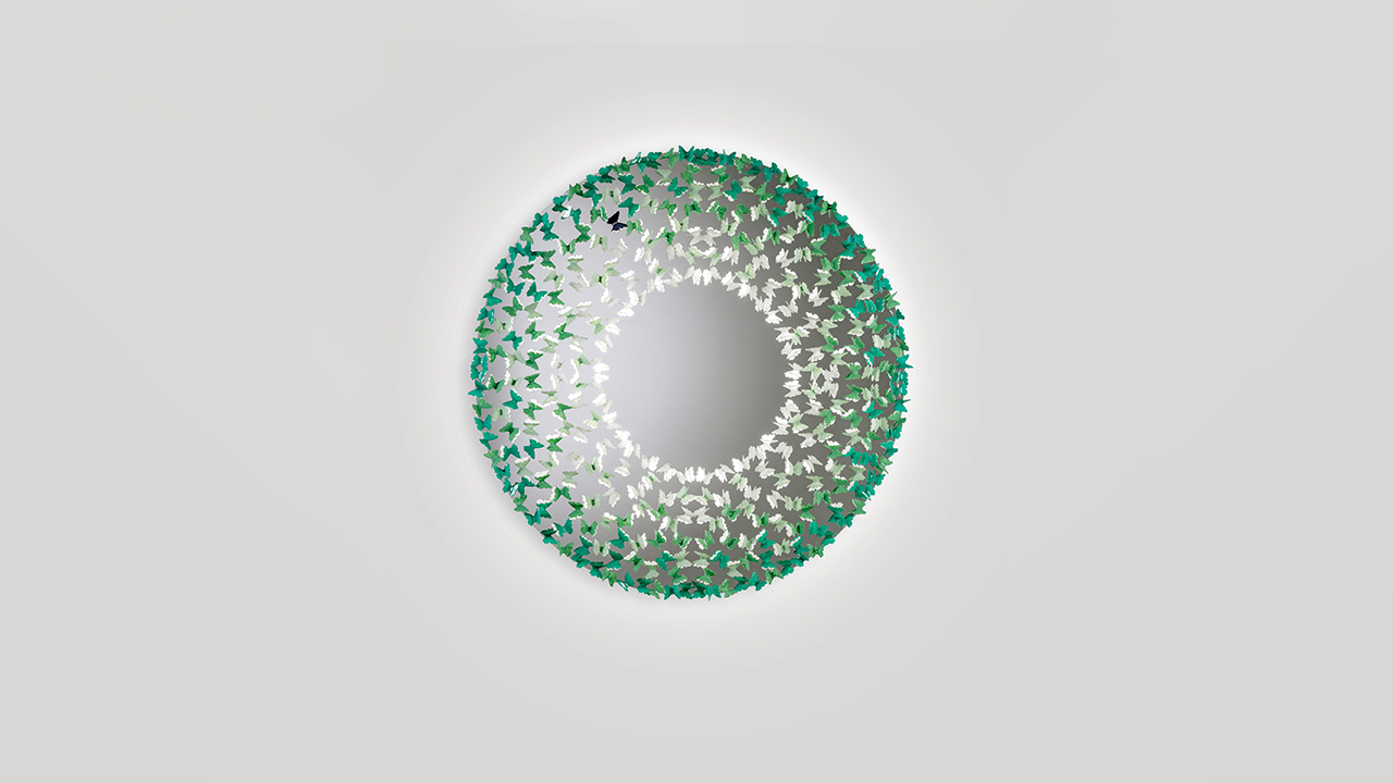 Specchio decorativo dal forte impatto emozionale, caratterizzato da una composizione di farfalle in vetro applicate su superficie riflettente extrachiara. La luce LED integrata valorizza la trasparenza del vetro e la vibrazione cromatica dei decori, trasformando lo specchio in un elemento scenografico oltre che funzionale.