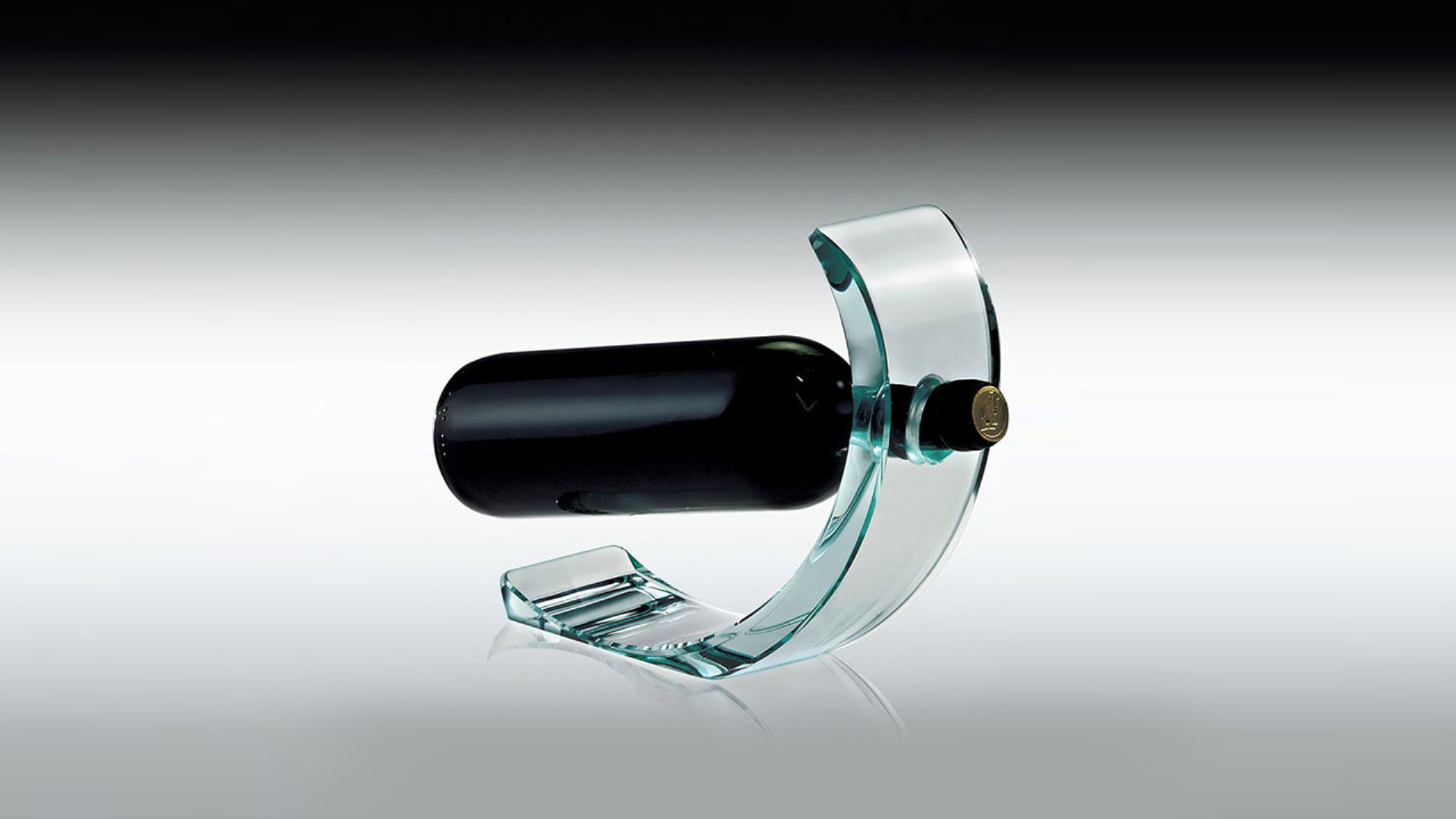 Porta-bottiglia realizzato in vetro extrachiaro curvato, caratterizzato da un design essenziale e da una lavorazione materica che valorizza trasparenza e spessore, pensato come elemento funzionale e decorativo per ambienti living e dining.