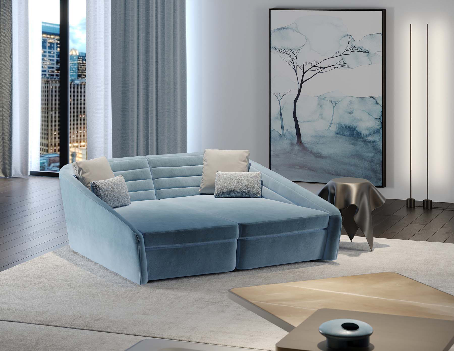Tavolino caratterizzato da una struttura essenziale in vetro curvato, pensato come complemento leggero e versatile, con forte attenzione alle finiture superficiali.
