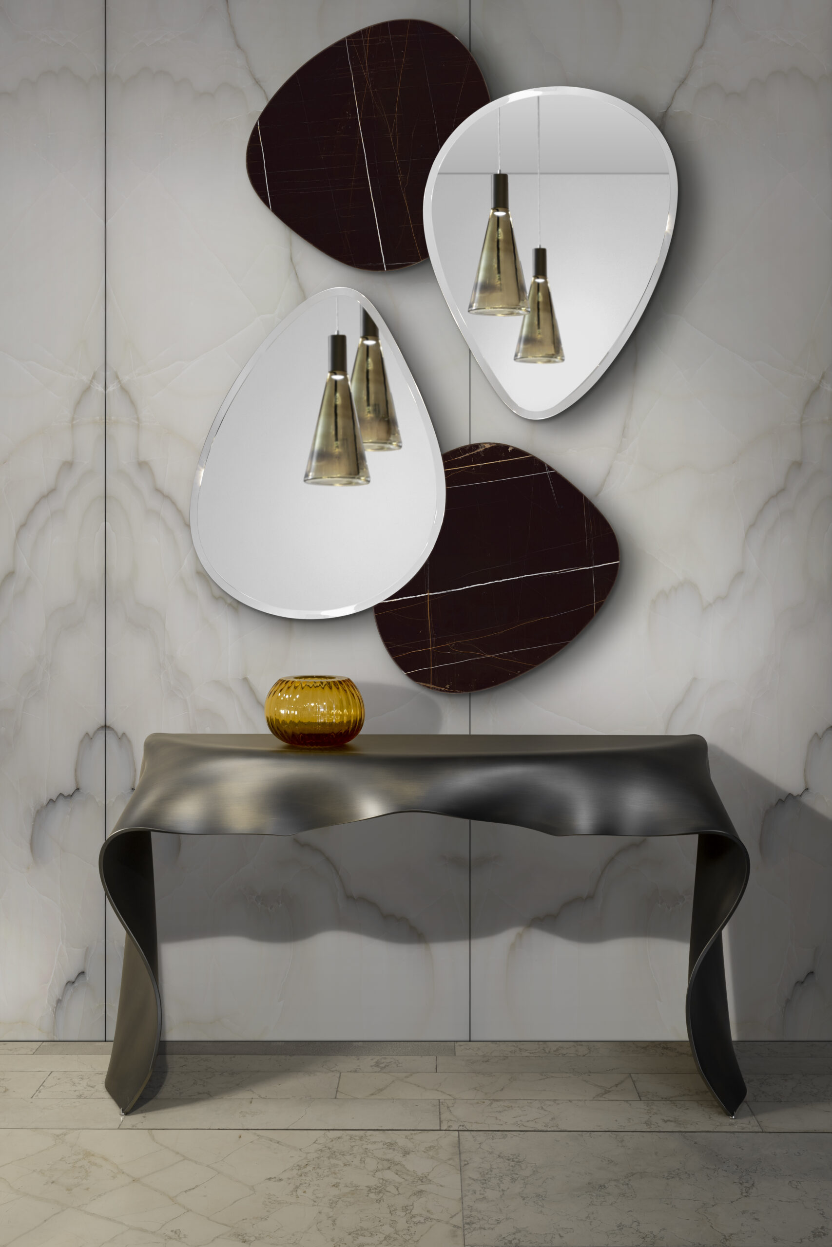 Console realizzata interamente in vetro curvato, caratterizzata da una forma scultorea continua e da finiture decorative che ne enfatizzano la leggerezza visiva.